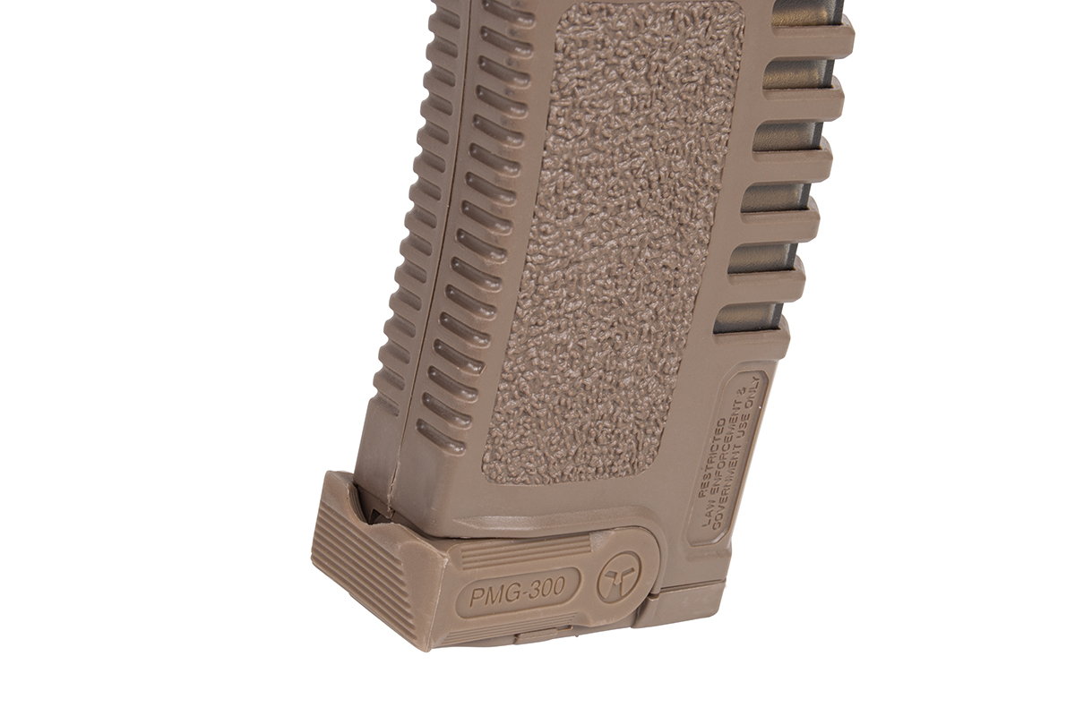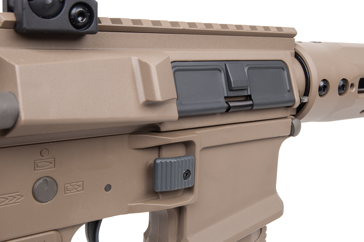 Die hochwertig verarbeitete S-AEG Waffe aus dem Hause ARES wird aus robustem Nylon Fiber gefertigt. Der Vorderschaft besteht aus Metall. An dem Aluminium-Außenlauf ist ein abnehmbarer Scar-Type Aluminium Flash-Hider montiert. Der Schiebeschaft lässt sich in sechs Positionen verstellen und verfügt über eine integrierte Wangenauflage.