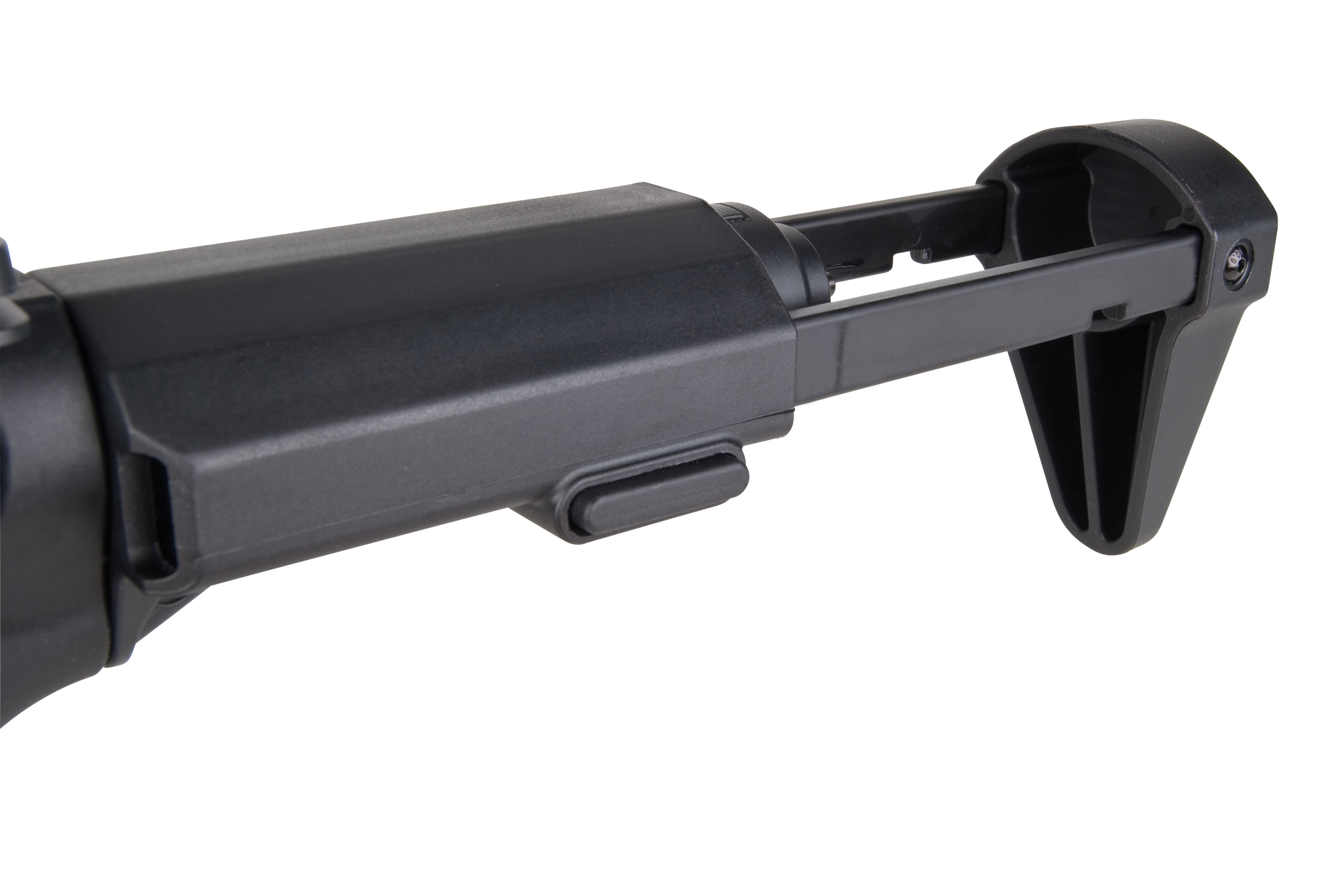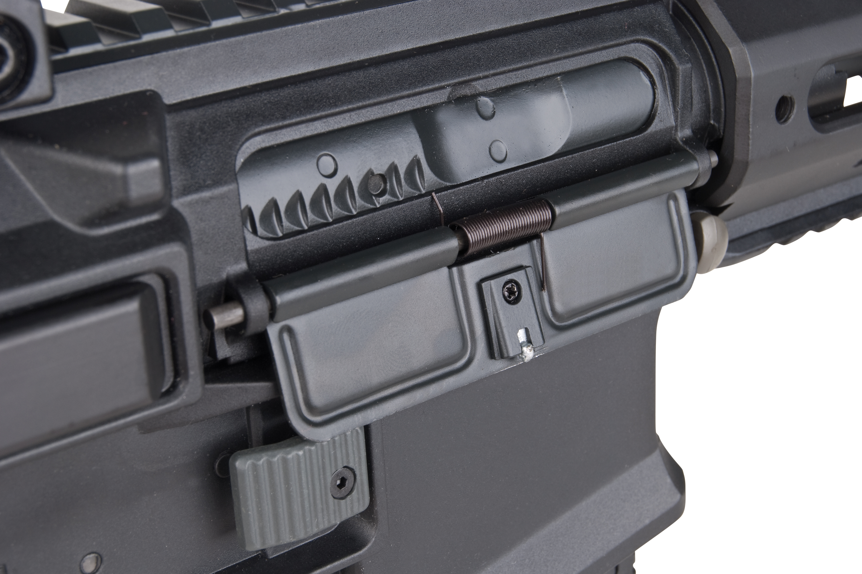 Die hochwertig verarbeitete S-AEG Waffe aus dem Hause ARES wird aus Nylon Fiber gefertigt. Der Vorderschaft besteht aus Metall. Sie verfügt über einen Schiebeschaft, eine Flip-Up Visierung, zwei Railschienen, einen Vorderschaft mit Handstopp, ein Schnellwechselmagazin und ein einstellbares Spin-Up System.