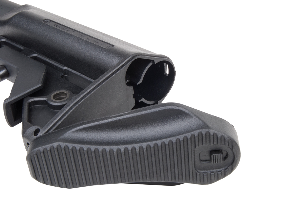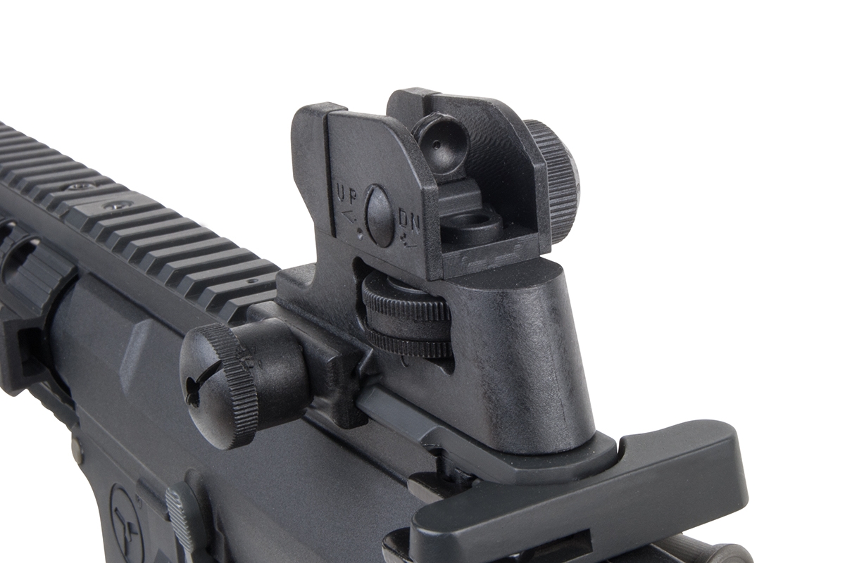Die hochwertig verarbeitete AEG Waffe ist aus Nylon-Fiber gefertigt und ist Silencer-kompatibel. Sie bietet dir verschiedene Railschienen, einen Schiebeschaft, eine abnehmbare & einstellbare Visierung und ein einstellbares Spin-Up System. Dieses befindet sich unter dem Hülsenauswurffenster und kann sehr leicht eingestellt werden. Der abnehmbare Mündungfeuerdämpfer wird mit einem 13,5 mm Rechtsgewinde befestigt.