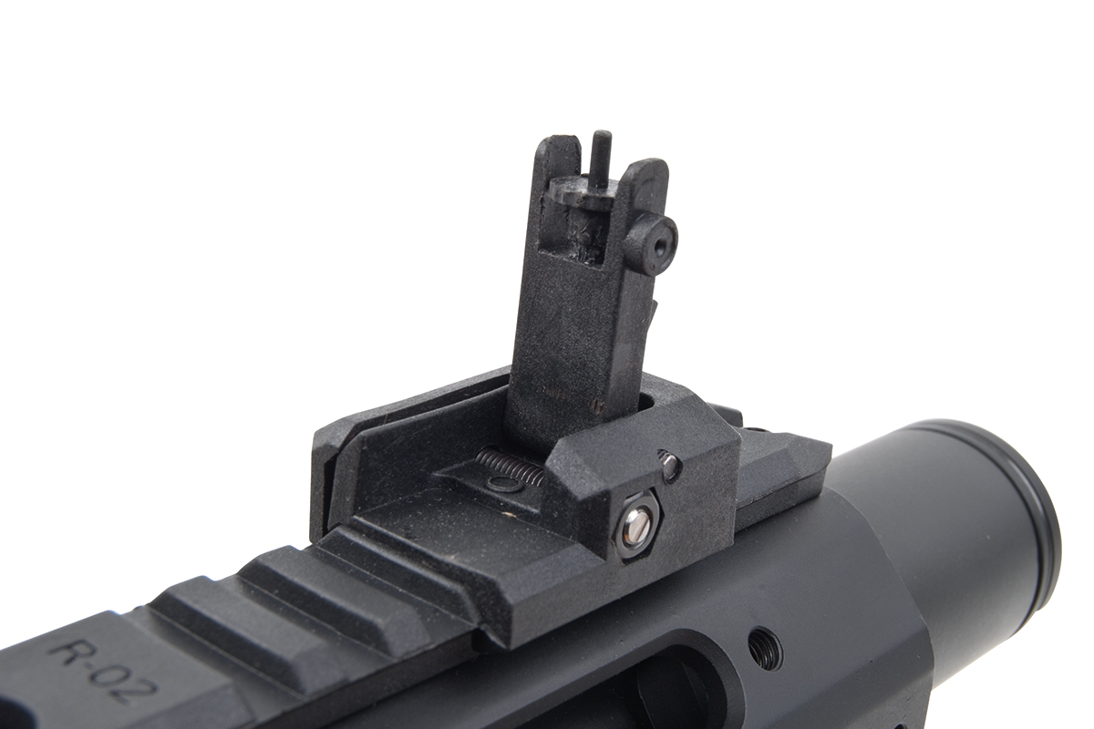 Die M4 015 ist natürlich mit dem beliebten Electronic Firing Control System (EFCS) ausgestattet. An der Unterseite befindet sich eine 6,5 cm Railschiene an der der mitgelieferte Handgriff montiert werden kann. Auf der Oberseite befindet sich ein spezielles R.A.S.-System. Dank der Bohrungen können nach Belieben 21mm Schienen angebracht werden. Perfekt für verschiedenstes Zubehör. Kimme und Korn sind beide klappbar. Das Spin-Up ist leicht einstellbar und befindet sich direkt unter dem Hülsenauswurffenster.