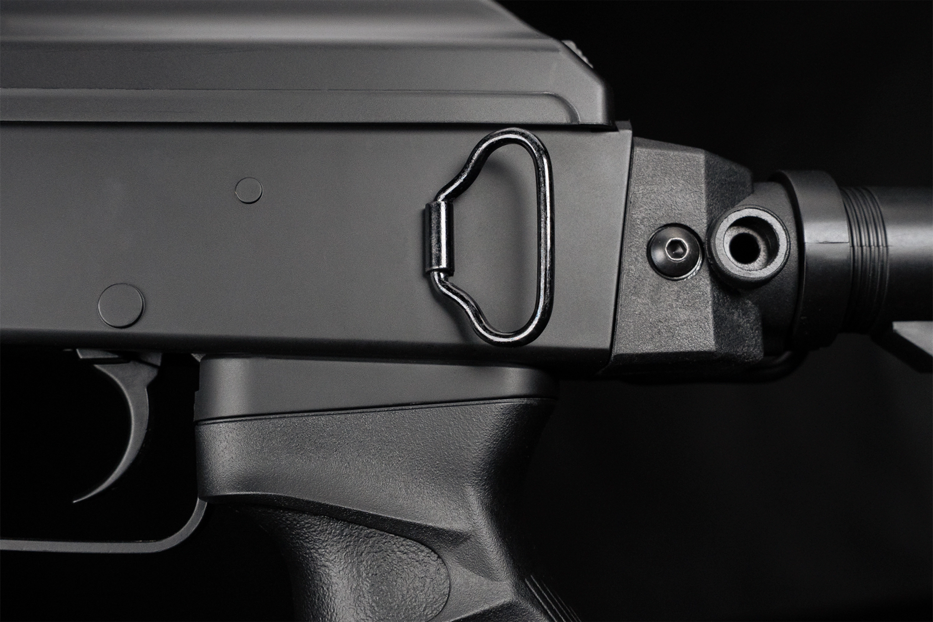 Der stabile Metall-Receiver wird durch einen leichten Polymer-Schaft, Griff und Handschutz ergänzt. Mehrere Picatinny-Rails ermöglichen die Montage von Optiken und Zubehör. Der klappbare Schaft sorgt für Flexibilität, besonders in beengten Spielsituationen.