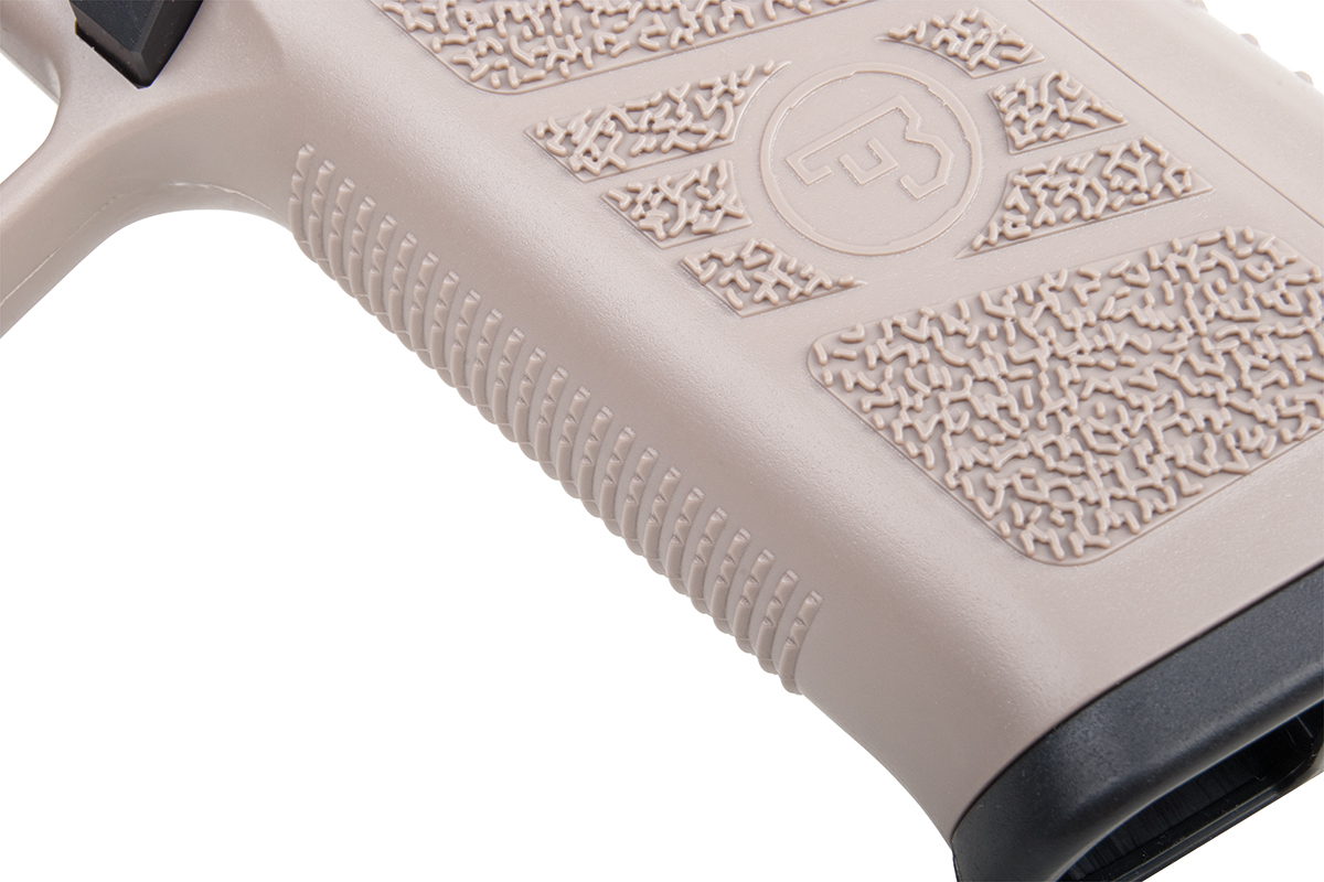 Die führige Einsatzpistole verfügt über eine integrierte Railschiene zur Anbringung verschiedener Zubehörteile, einen gezogenen Lauf, eine 3-Punkt-Visierung, eine beidhändige Sicherung, eine individuelle Seriennummer und ein Doppelmagazin mit 2x8 Schuss.