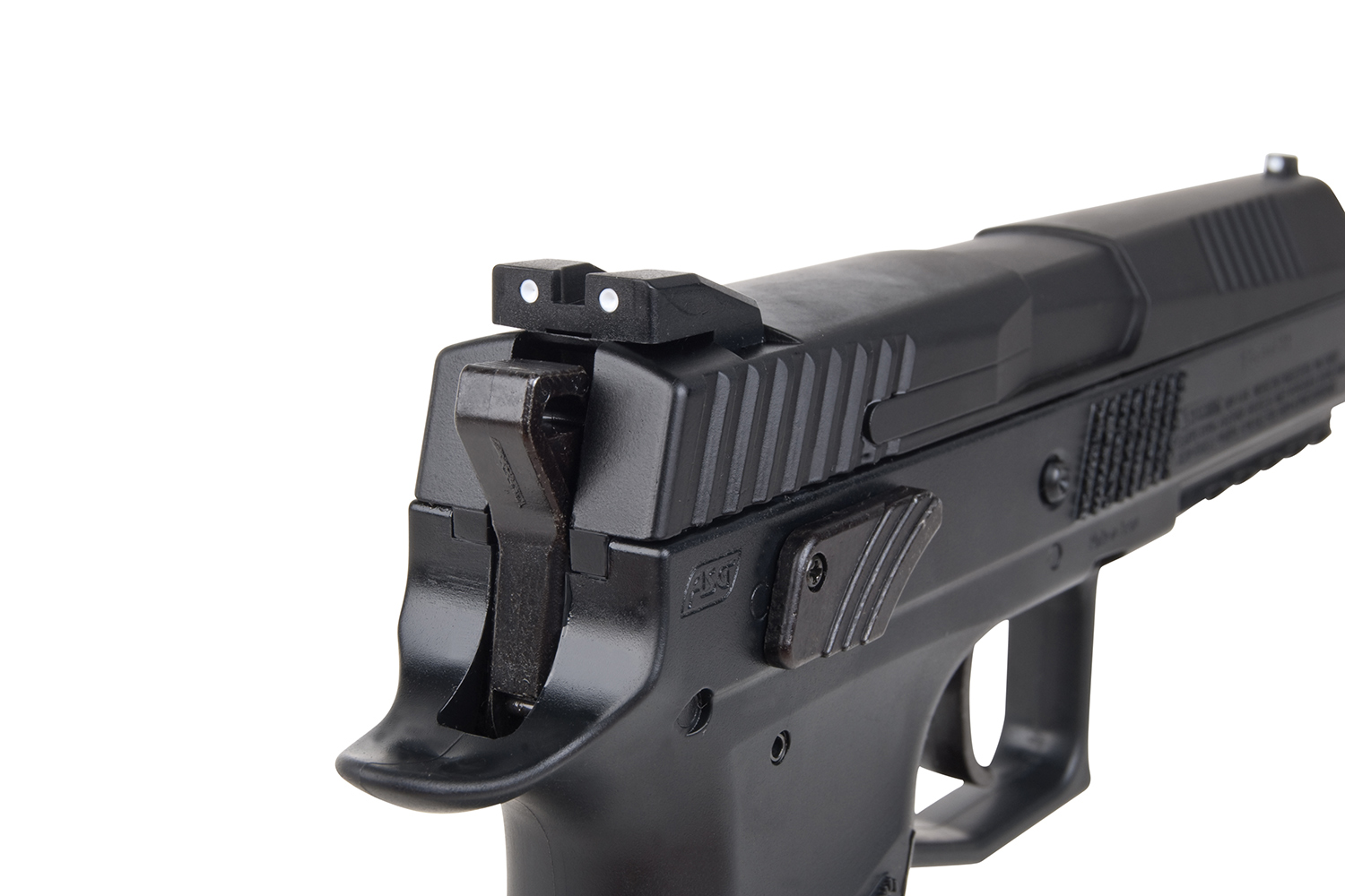 Die hochwertige Replika aus dem Hause ASG ist kompatibel mit 4,5mm Diabolos. Der repetierende Metallschlitten sorgt für ein sehr realistisches Blowback-Erlebnis. Die führige Einsatzpistole verfügt über eine integrierte Railschiene zur Anbringung verschiedener Zubehörteile, einen gezogenen Lauf, eine 3-Punkt-Visierung, eine beidhändige Sicherung, eine individuelle Seriennummer und ein Doppelmagazin mit 2x8 Schuss.