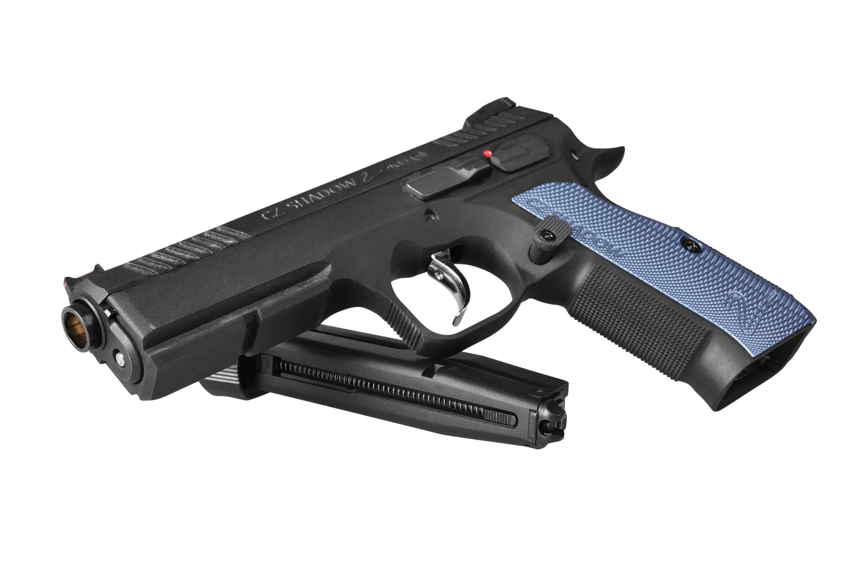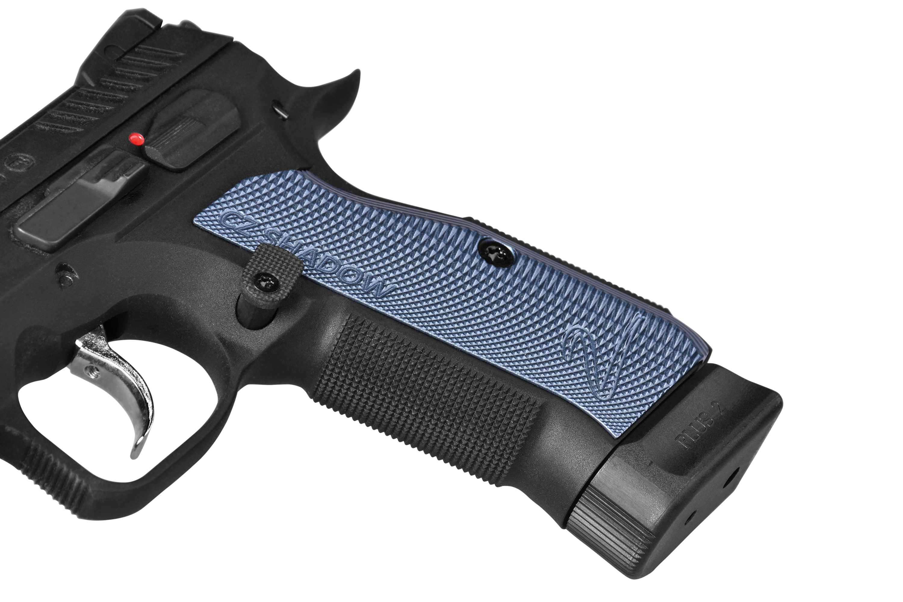 Der Schlitten ist aus eloxiertem Aluminium gefertigt und bietet ein eckigeres Design. Tiefere und ausgeprägtere Serrations am Schlitten erlauben einen festeren Griff. Darüber hinaus fördert die ausgeprägte Struktur am Griffstück in Kombination mit den CNC-gefrästen Griffschalen mit dünnerem Profil einen optimalen Grip. Der Abzugsbügel der Shadow 2 wurde verlängert, um den Zugang zum Abzug zu erleichtern und ein überlegenes Schießerlebnis auch mit Handschuhen zu ermöglichen.