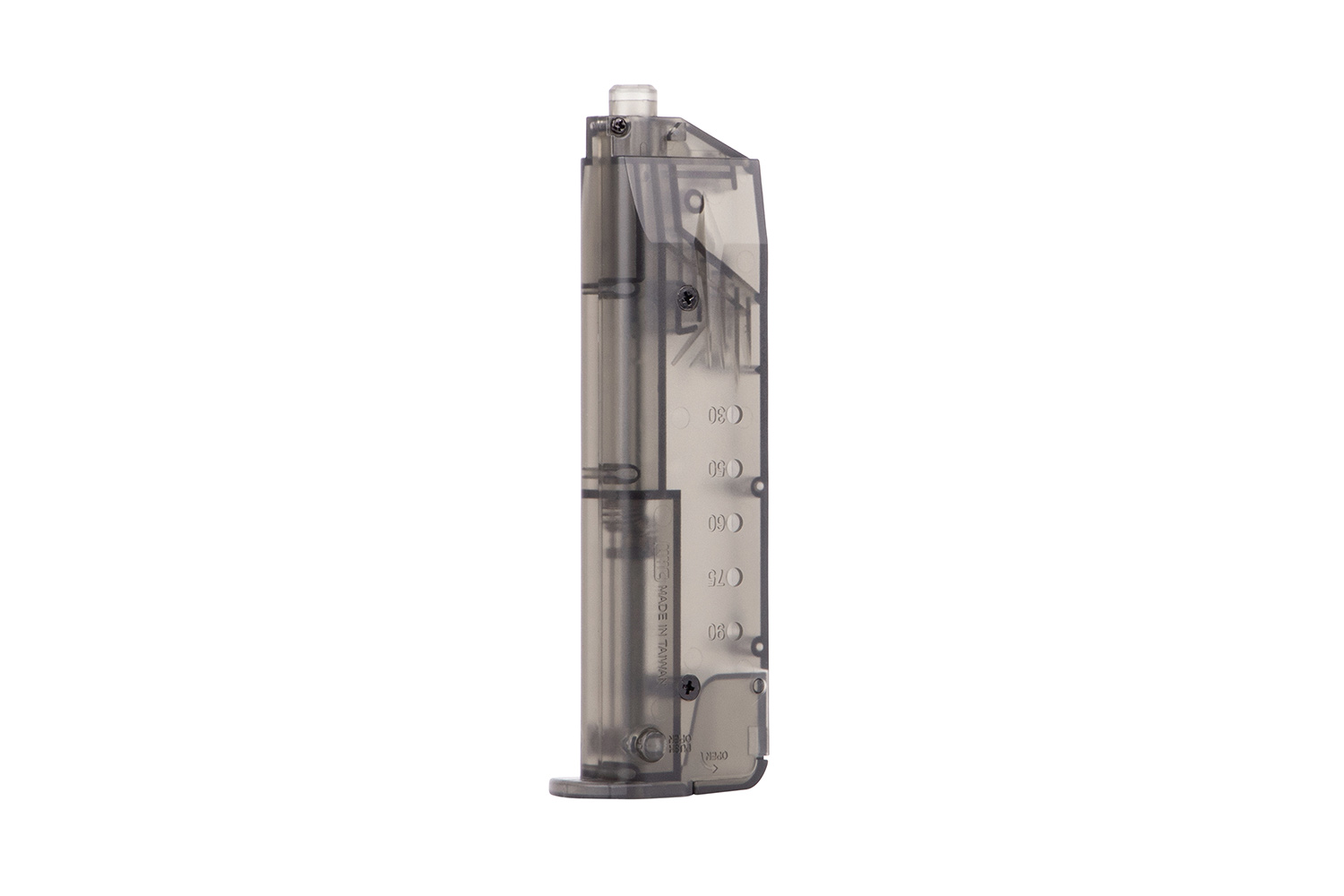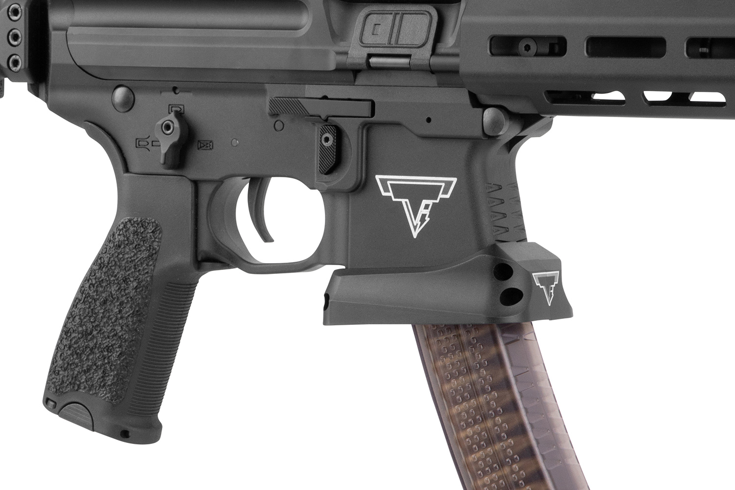 - Halbtransparentes Magazin mittlerer Kapazität für 100 Schuss mit TTI-lizenzierter Bodenplatte für zusätzliches Gewicht
