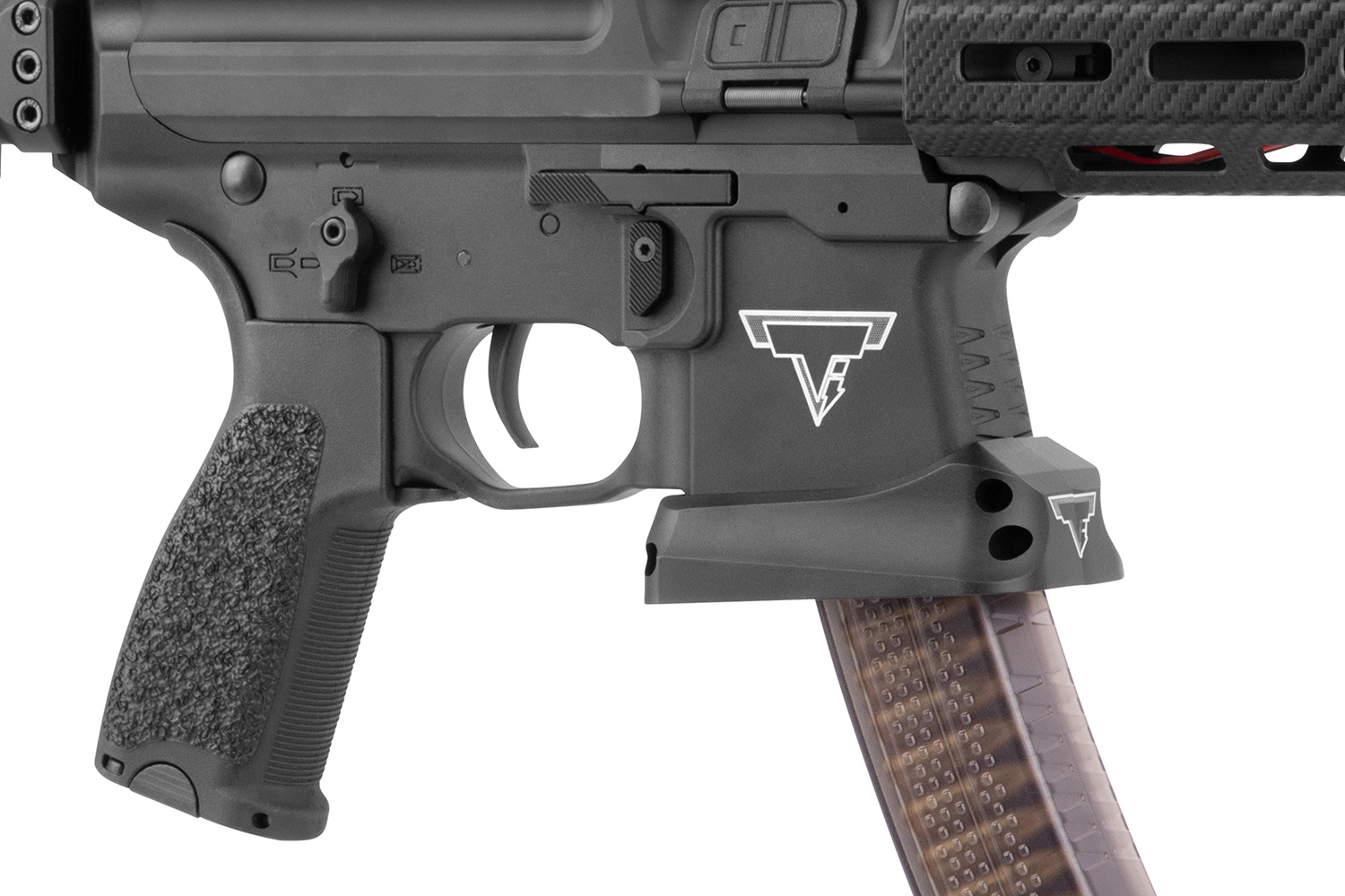 • Halbtransparentes Magazin mittlerer Kapazität für 100 Schuss mit TTI-lizenzierter Bodenplatte für zusätzliches Gewicht