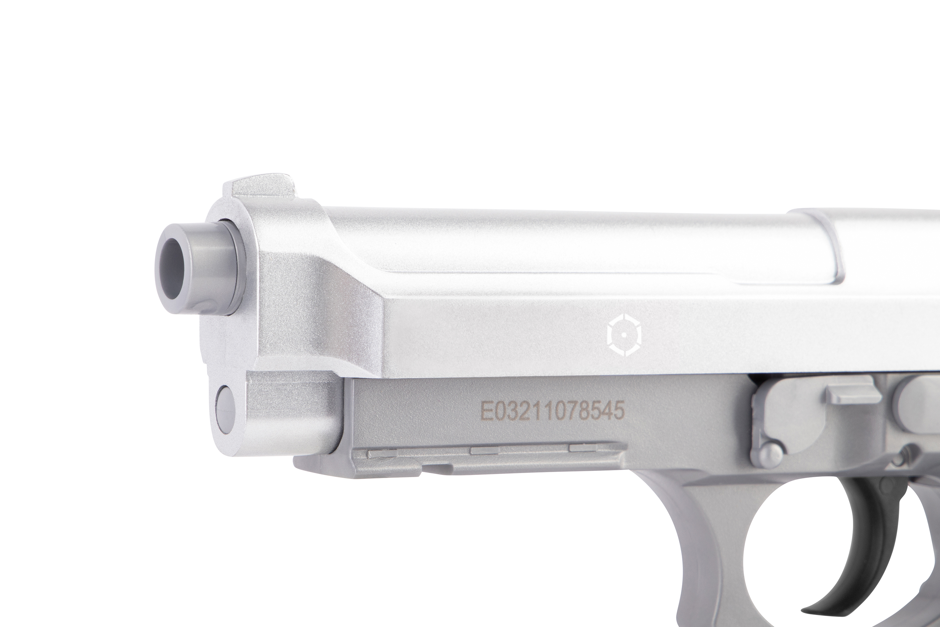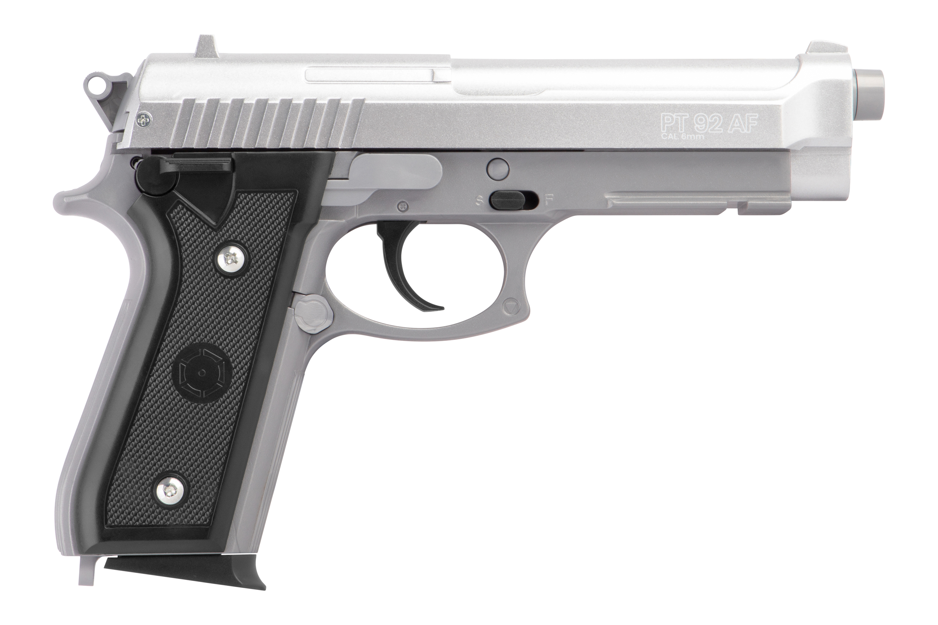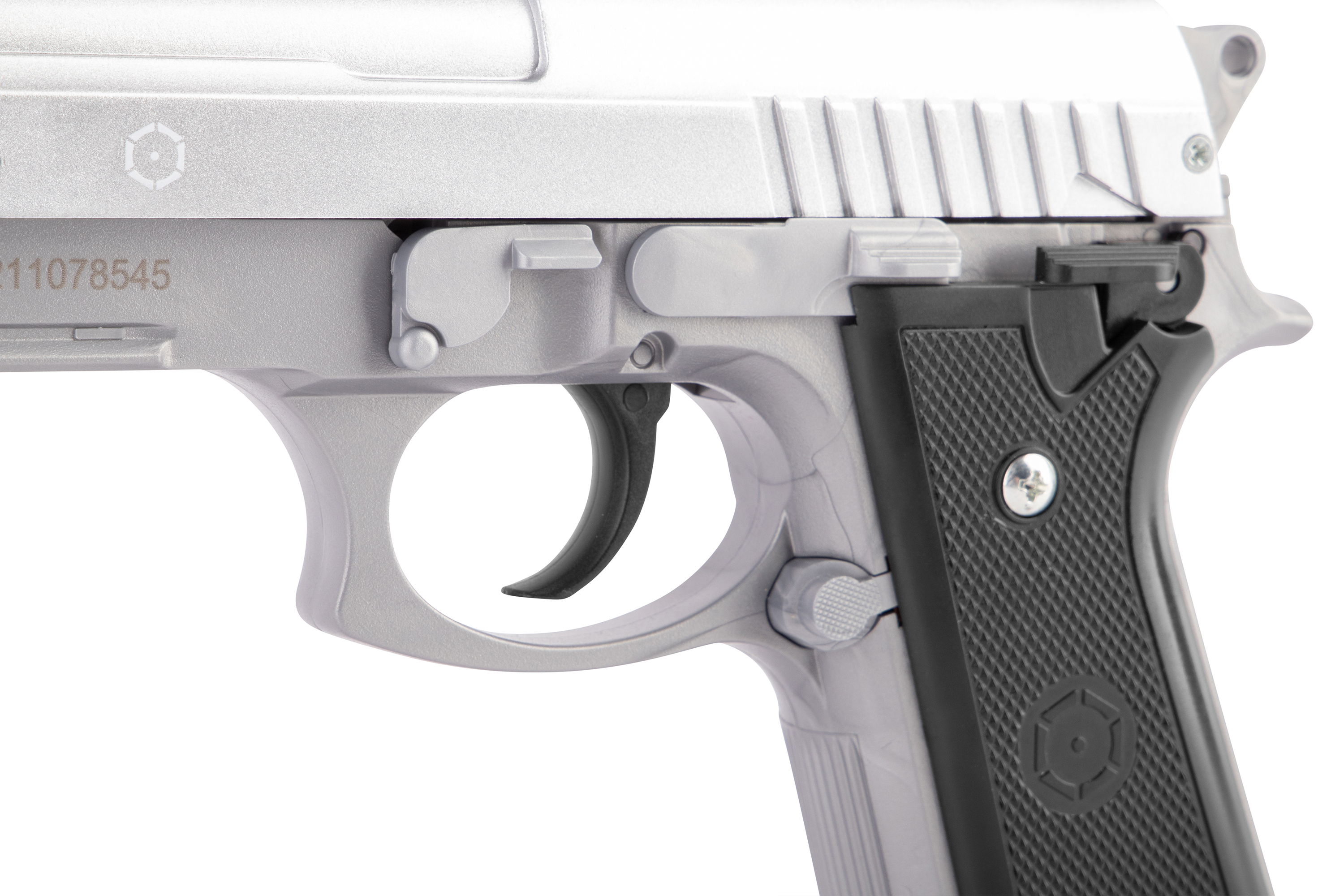 Die Cybergun PT92 bietet als Federdruck Luftpistole ein schlag- und kratzfestes Gehäuse aus Kunststoff mit einem Metallschlitten. Frei ab 14 Jahren liegt sie durch ihr angenehmes Gewicht und dem strukturiertem Griffstück gut in der Hand.