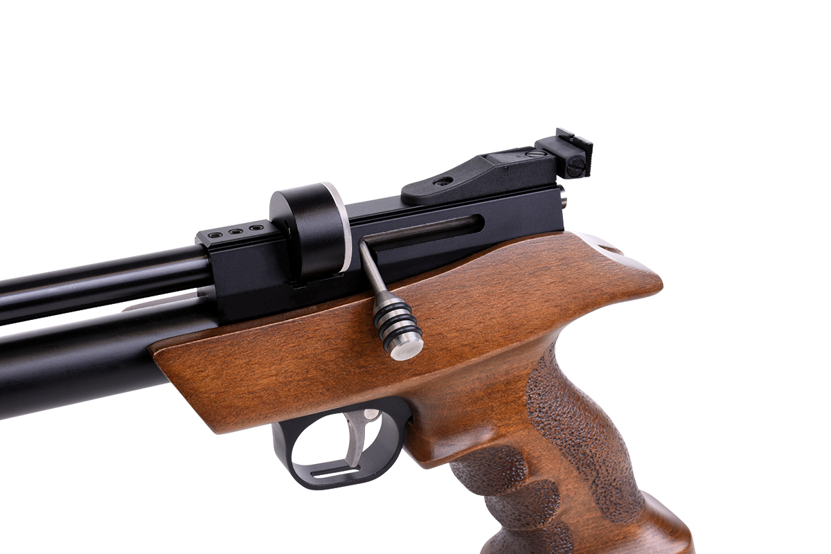 Die DIANA bandit mit integriertem Regulator ist eine leistungsstarke Pressluft-Pistole mit ergonomischen Buchenholz-Griffstück und aufgedrehtem Schalldämpfer. Die Pistole kann mit einer Einlage im Einzelschuss-Modus und mit einem 7-Schuss Trommelmagazin betrieben werden. Die gefräste Prismenschiene ermöglicht den Anbau einer passenden Optik. Der maximale Fülldruck beträgt 200 bar.