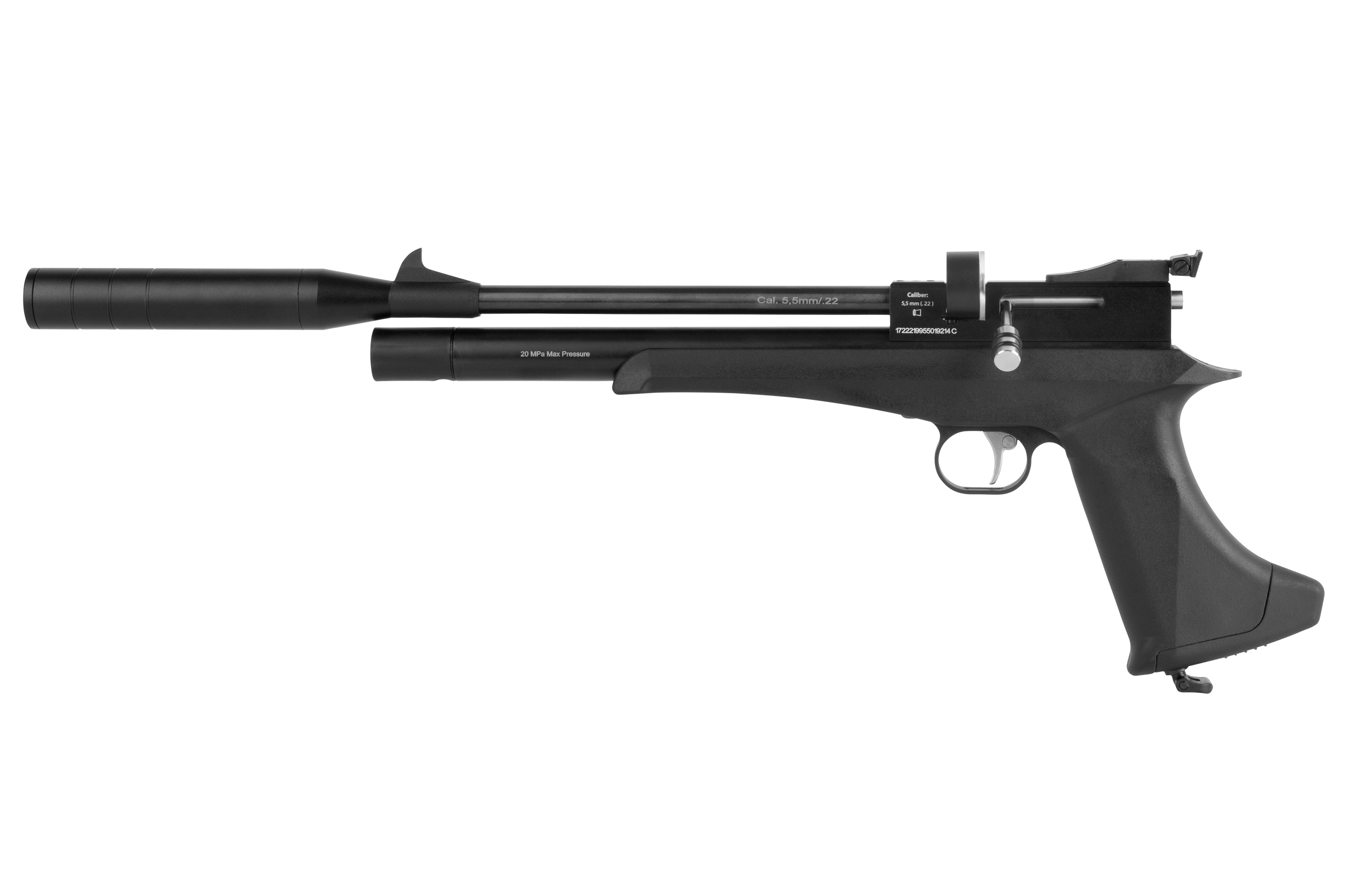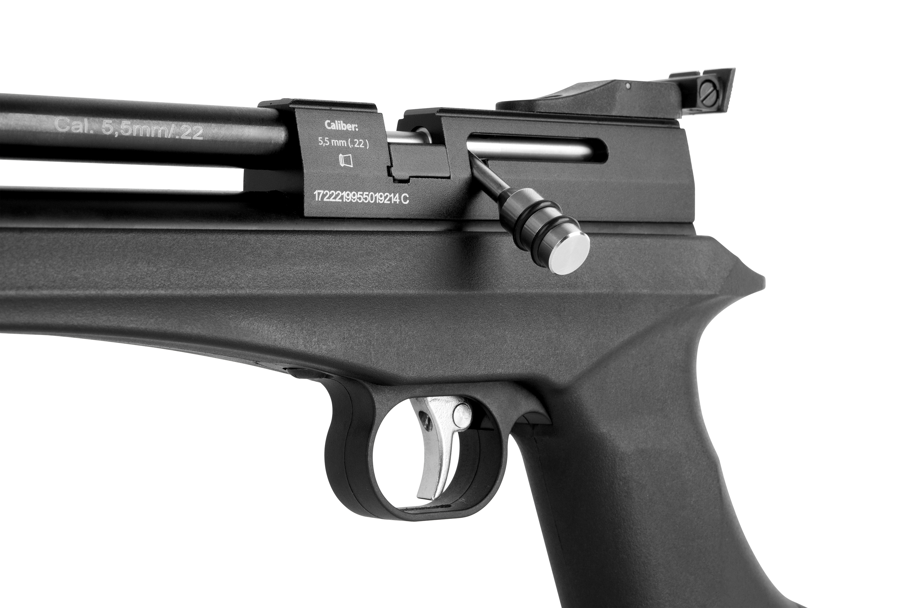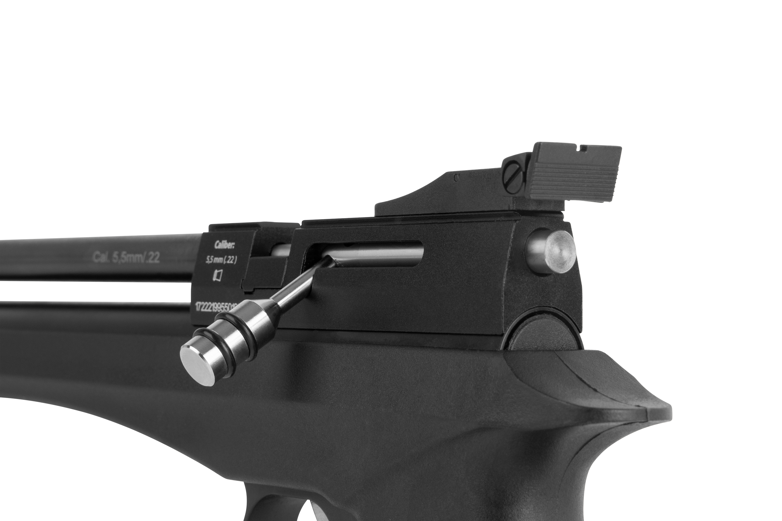Die DIANA bandit mit integriertem Regulator ist eine leistungsstarke Pressluft-Pistole mit abnehmbarer Schafterweiterung und aufgedrehtem Schalldämpfer. Die Pistole kann mit einer Einlage im Einzelschuss-Modus und mit einem 7-Schuss Trommelmagazin betrieben werden. Die gefräste Prismenschiene ermöglicht den Anbau einer passenden Optik. Der maximale Fülldruck beträgt 200 bar.