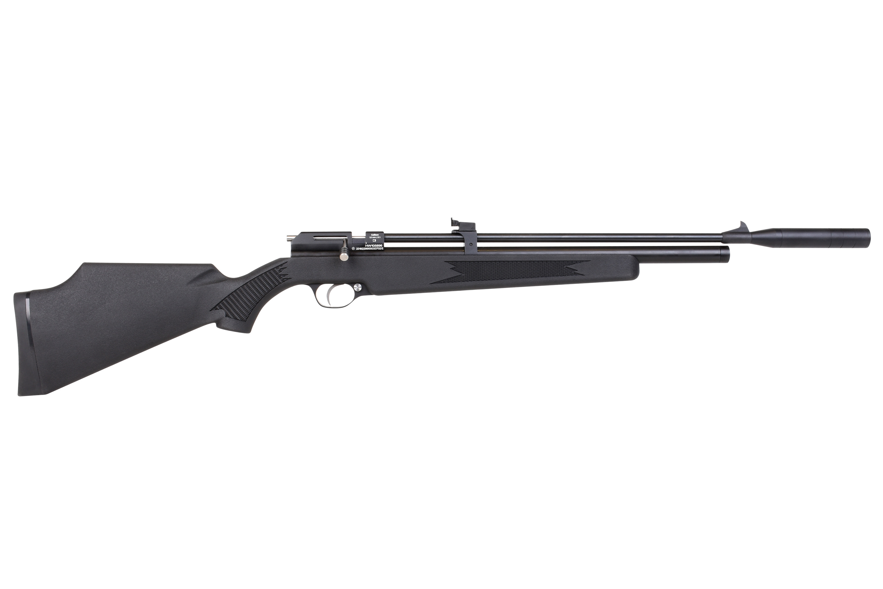 Das Modell verfügt über eine gefräste Prismenschiene, einen Schalldämpfer, eine einstellbare Mikrometer-Visierung, eine gummierte Schaftkappe und eine manuelle Sicherung.