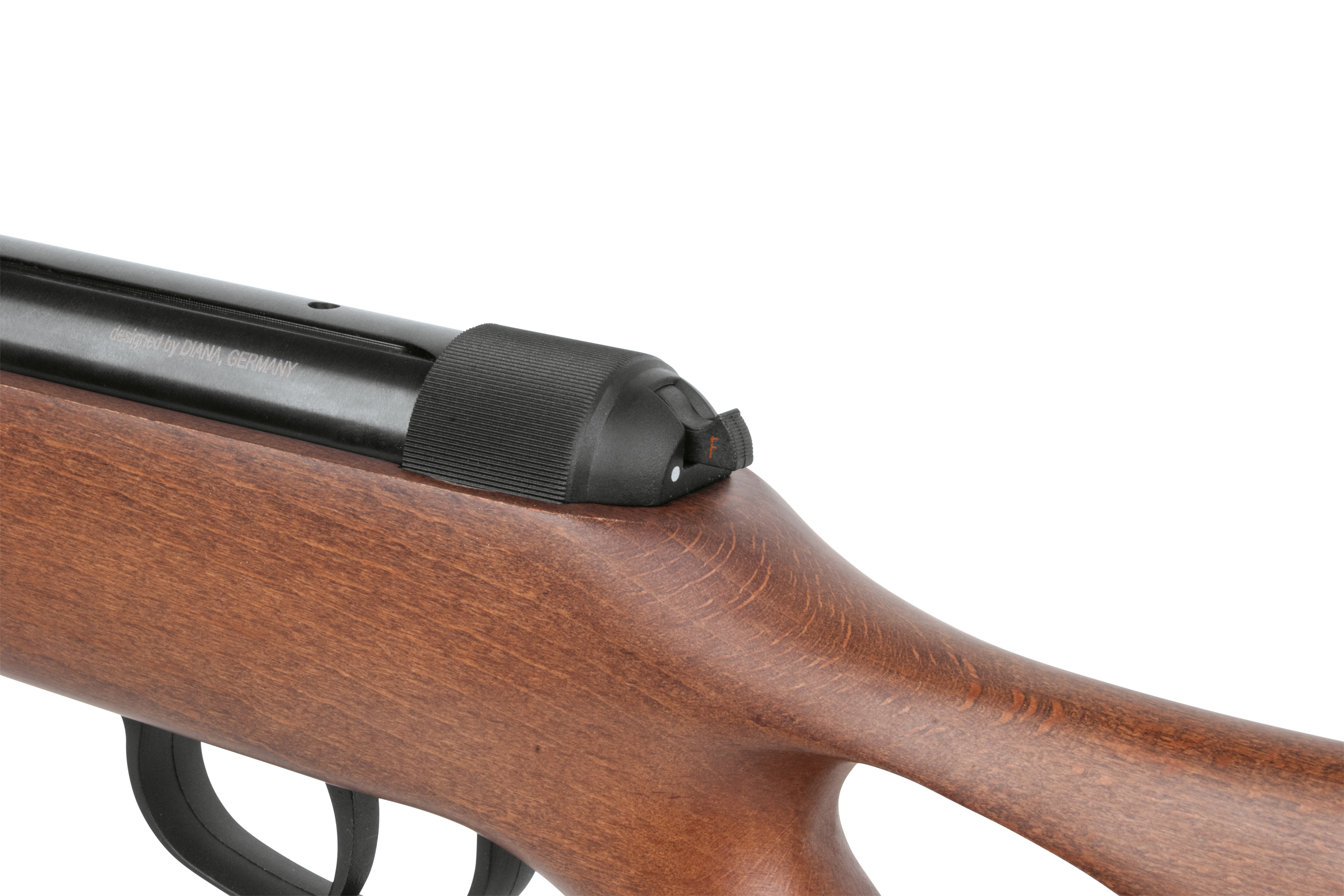 Das Diana-Luftgewehr in modernem Design mit ergonomischen Lochschaft verfügt über eine gummierte Schaftkappe und eine gefräste Prismenschiene.