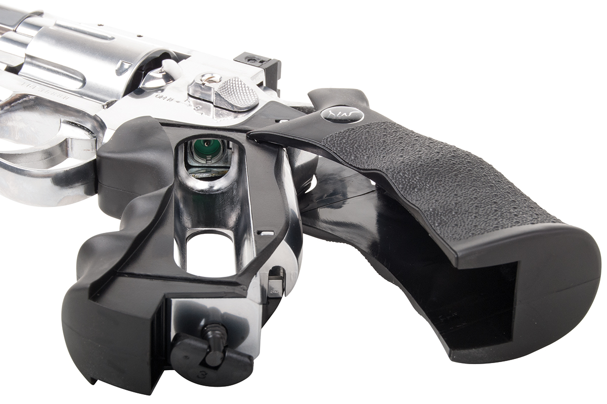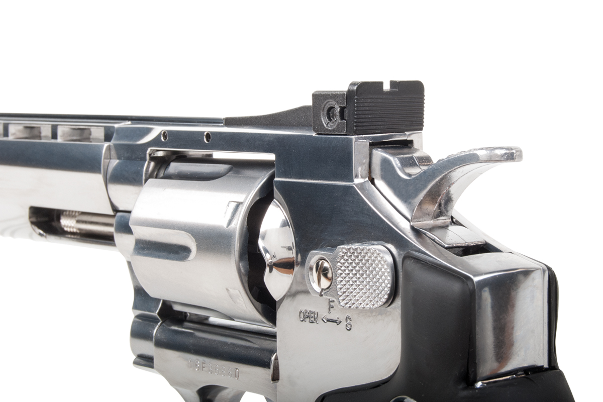 Der detailgetreue Nachbau aus dem Hause ASG mit einer Energie von ca. 1,8 Joule wird mit Co2 betrieben. Der Revolver aus Vollmetall verfügt über einen Double Action Abzug, verstellbarer Visierung und robuste Kunststoffgriffschalen. Im Lieferumfang enthalten sind eine Montageschiene kurz und lang, ein Speedloader und 6 Hülsen.