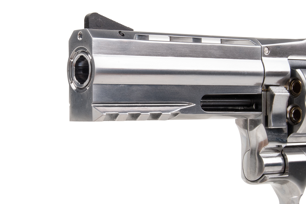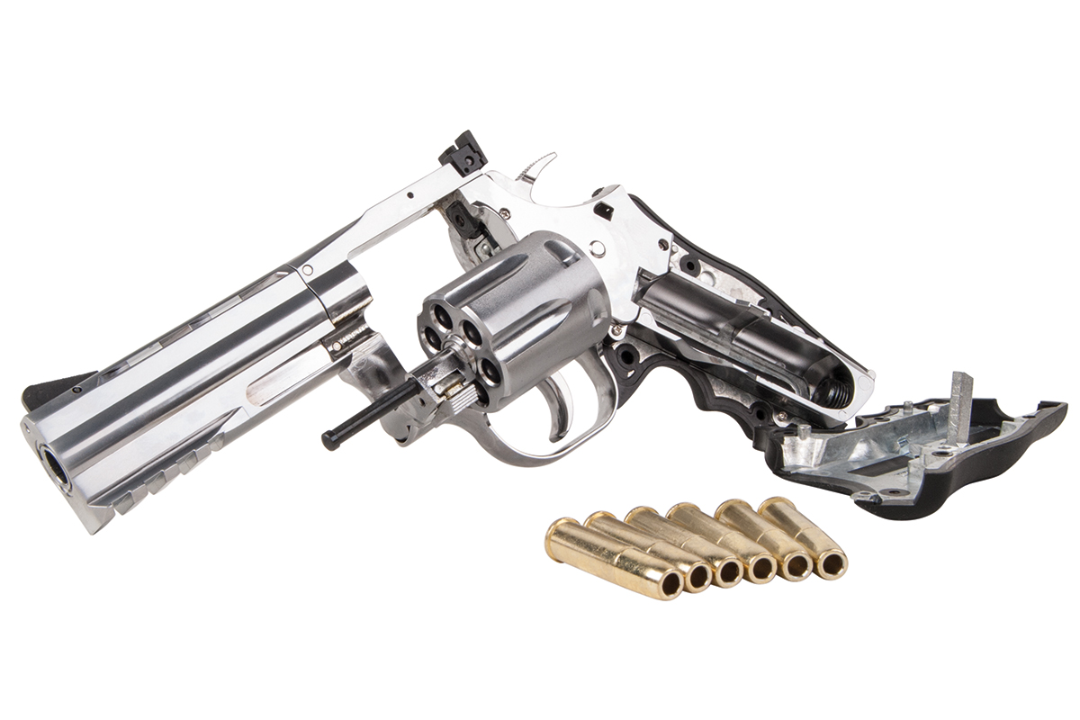 Der hochwertig verarbeitete Nachbau aus dem Hause ASG in Kaliber 4,5mm Diabolo wird mit CO2 betrieben. Der Revolver aus Vollmetall verfügt über eine individuelle Seriennummer, einen gezogenen Lauf, einen Double Action Abzug, eine verstellbare Visierung und ein gummiertes Griffstück im Hogue Design. Im Lieferumfang sind ein Speedloader und 6 Hülsen enthalten. Im Griffstück befindet sich zusätzlich ein Innensechskantschlüssel, mit welchem die Co2-Kapsel ganz einfach zu installieren ist.