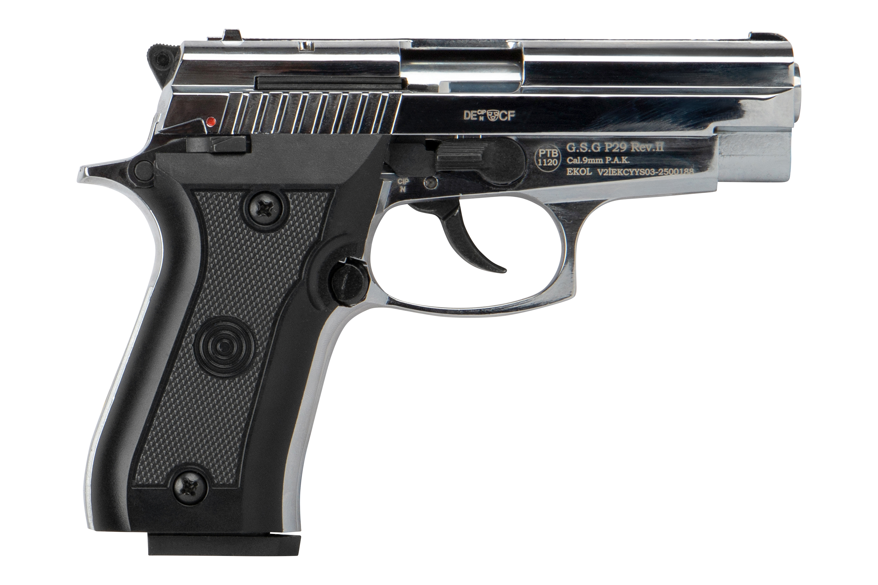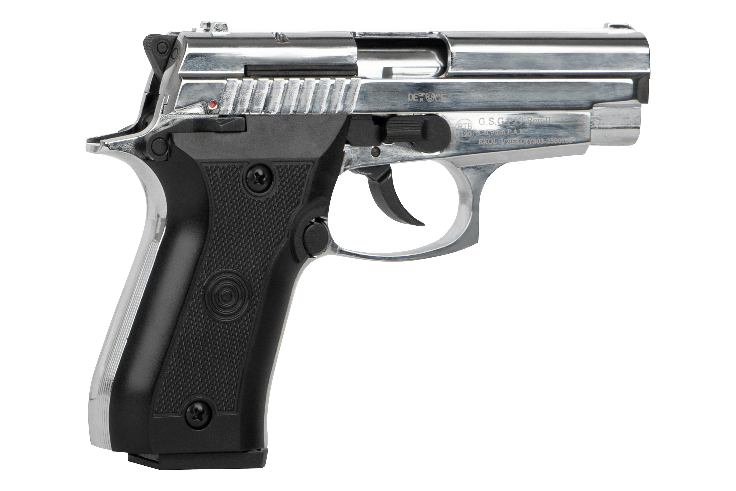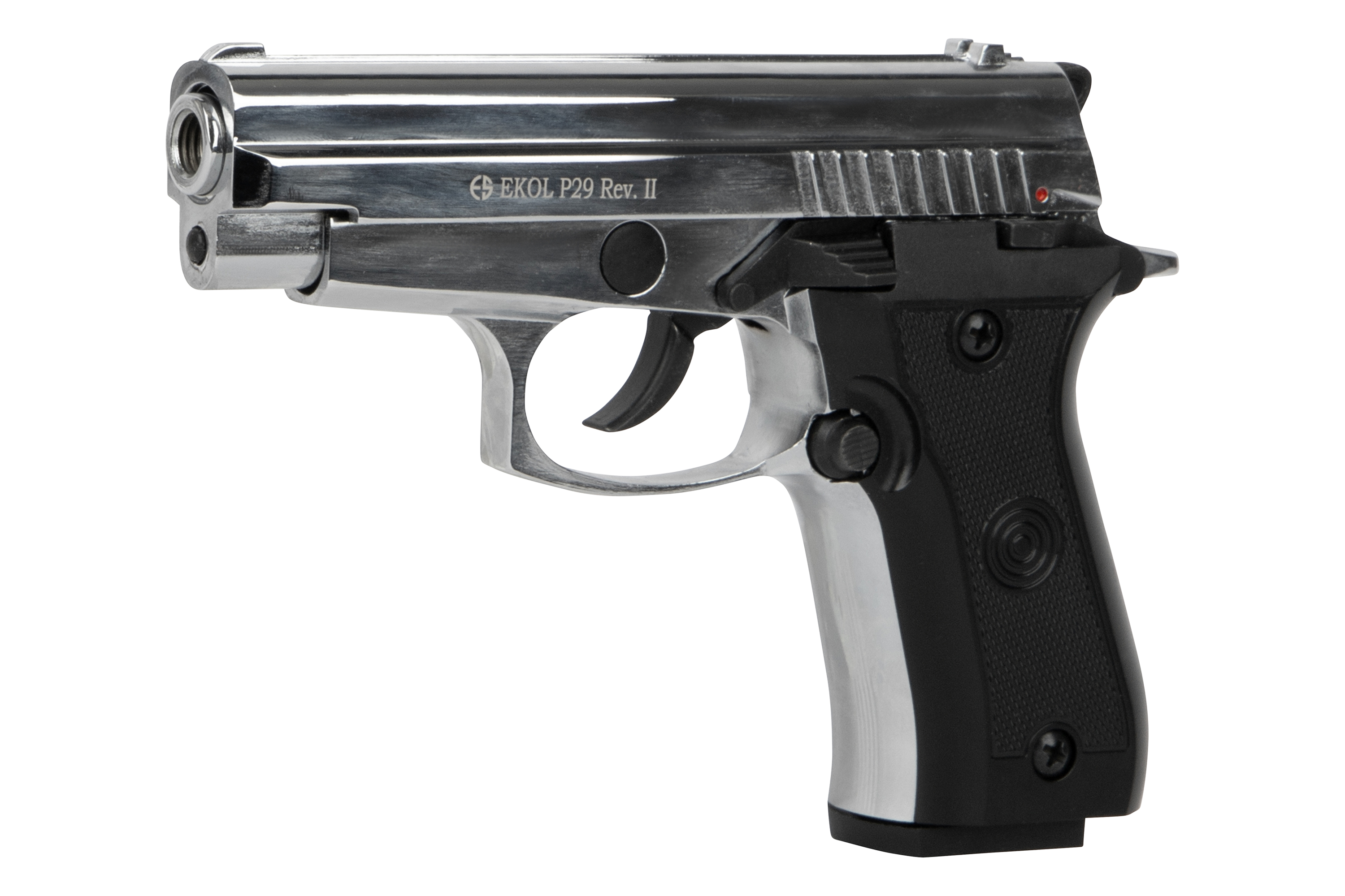 Die Ekol P29 in der stylischen Chrom-Ausführung ist eine zuverlässige Gas-Signal-Pistole im Kaliber 9mm P.A.K., die sich durch ihre kompakte Bauweise, hochwertige Verarbeitung und realistische Handhabung auszeichnet. Mit ihrem klassischen Design und der robusten Konstruktion eignet sie sich perfekt für den Einsatz an Silvester, zur Selbstverteidigung mit Gas- oder Pfefferpatronen sowie für Signalmunition.