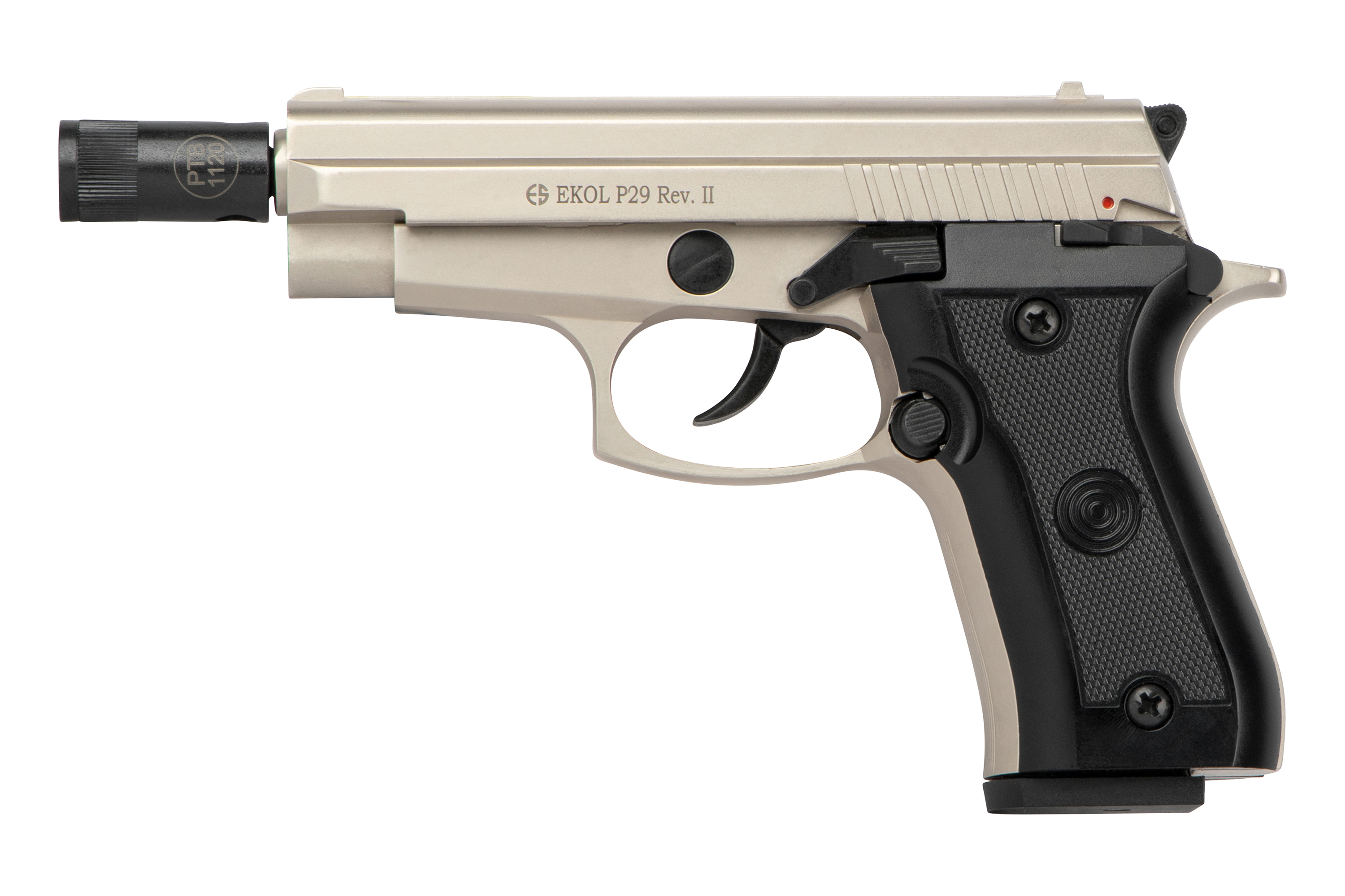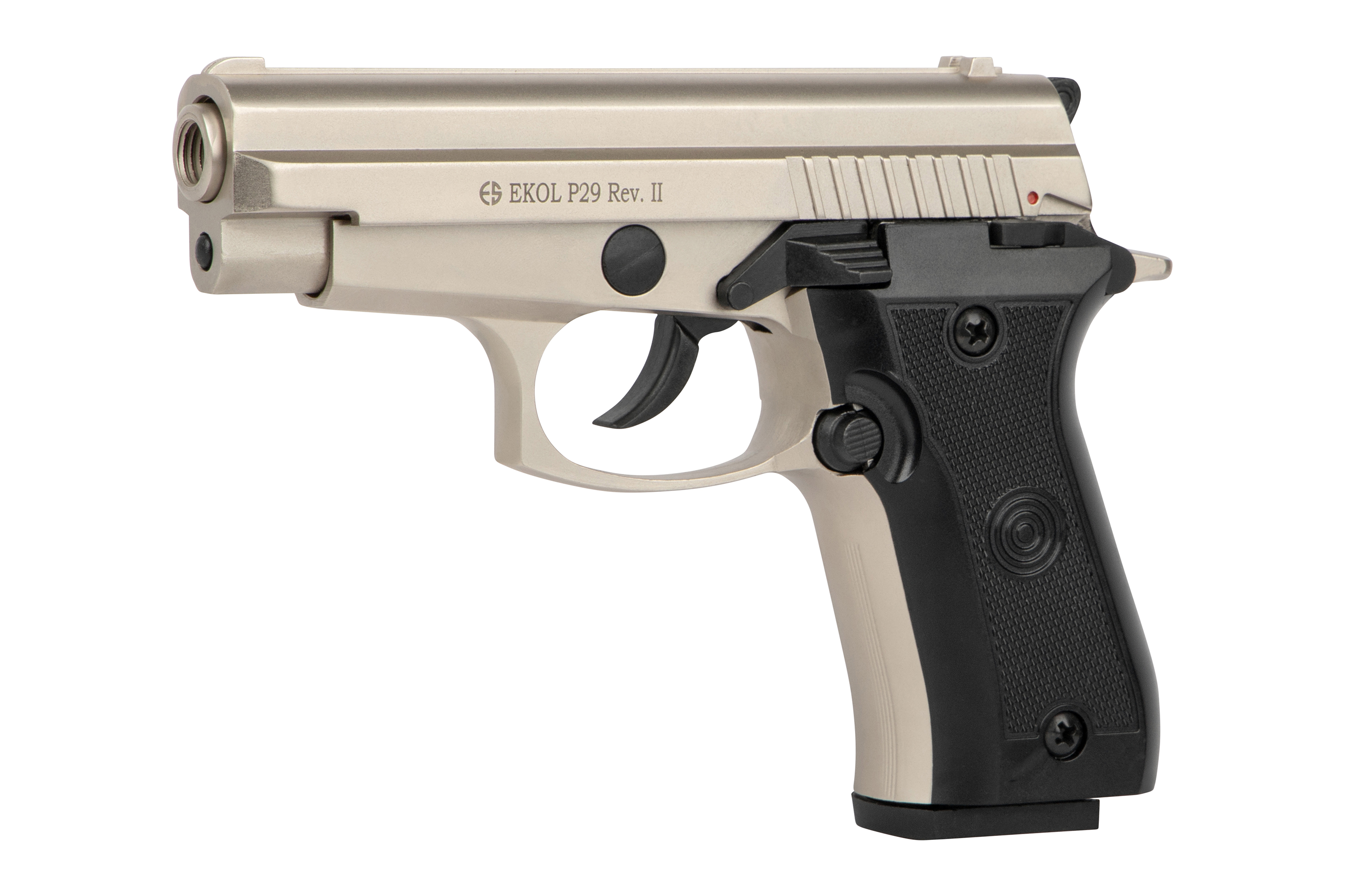 Die Ekol P29 in der eleganten Nickel-Ausführung ist eine zuverlässige Gas-Signal-Pistole im Kaliber 9mm P.A.K., die sich durch ihre kompakte Bauweise, hochwertige Verarbeitung und realistische Handhabung auszeichnet. Mit ihrem klassischen Design und der robusten Konstruktion eignet sie sich perfekt für den Einsatz an Silvester, zur Selbstverteidigung mit Gas- oder Pfefferpatronen sowie für Signalmunition.