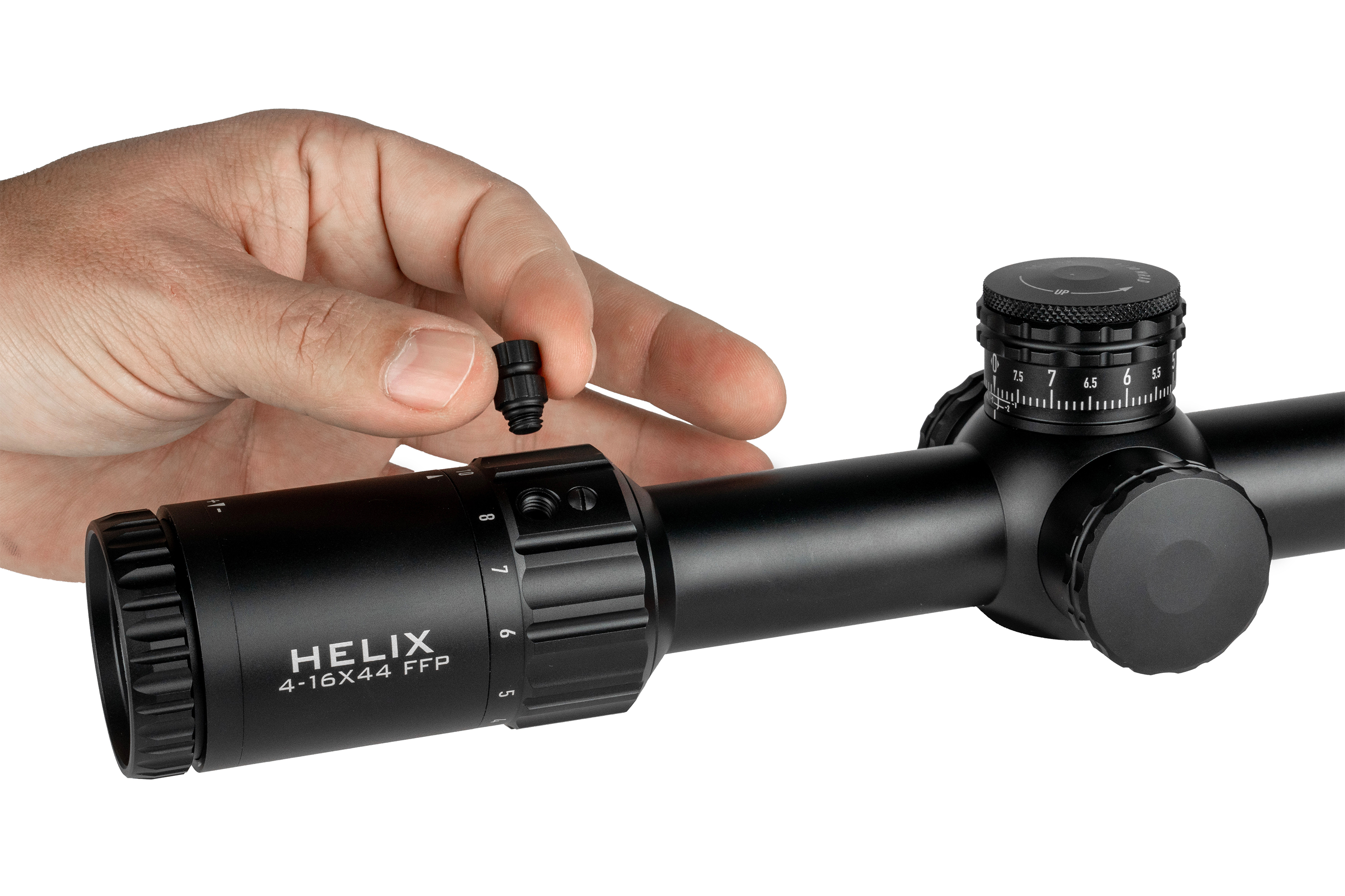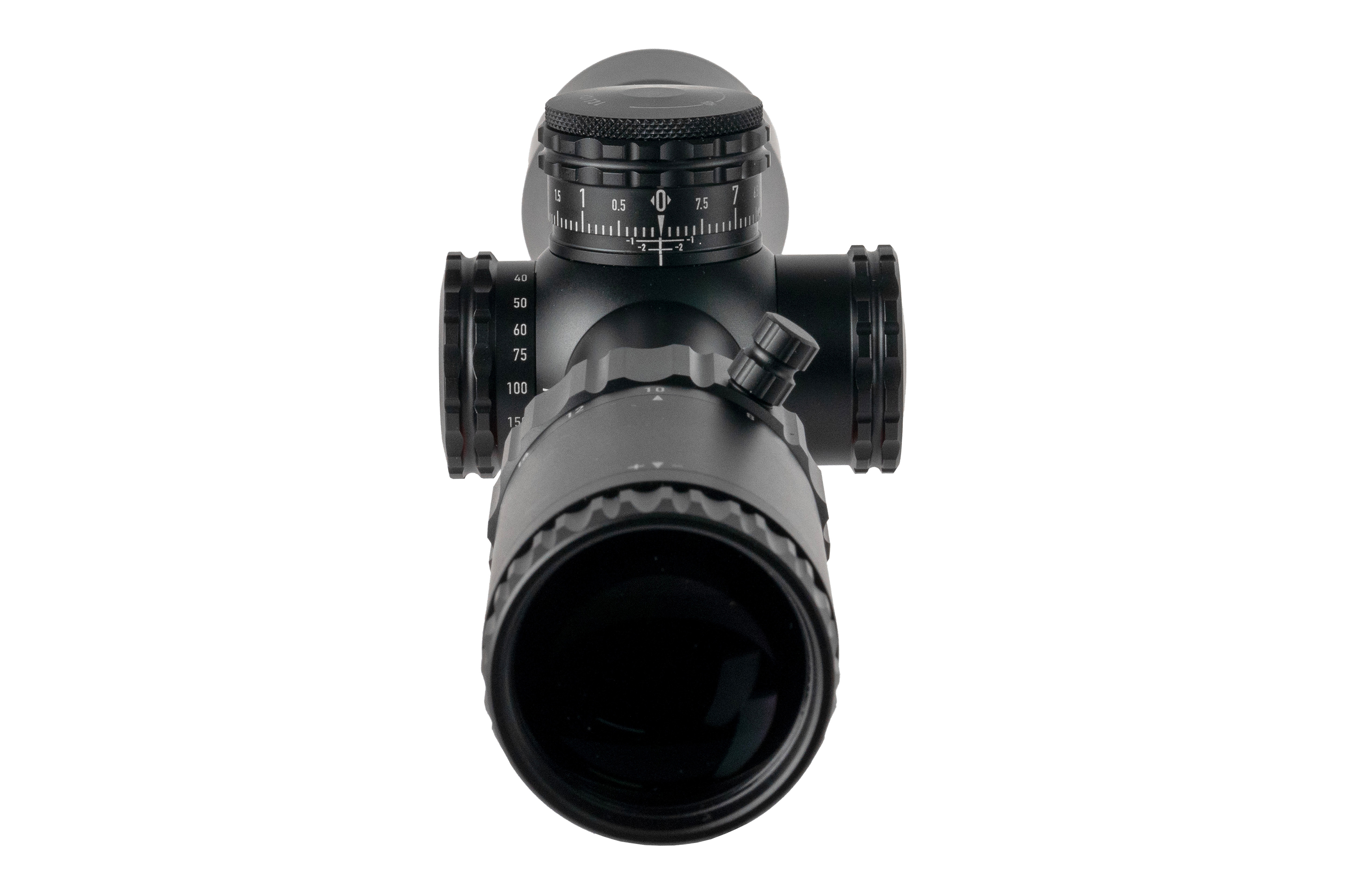 Neues Design mit verbessertem Klickgefühl, größerem Durchmesser (8 MRAD / 20 MOA pro Umdrehung) und niedrigerem Profil. Der Höhenturm bleibt offen mit Zero-Stop, der Seitenturm ist mit einem Gewindeschutzring versehen.