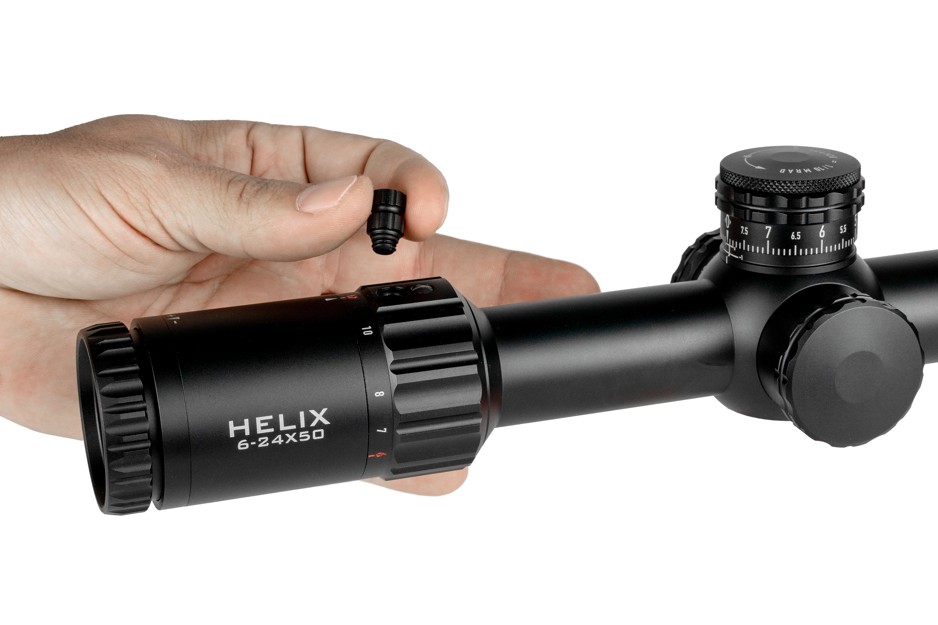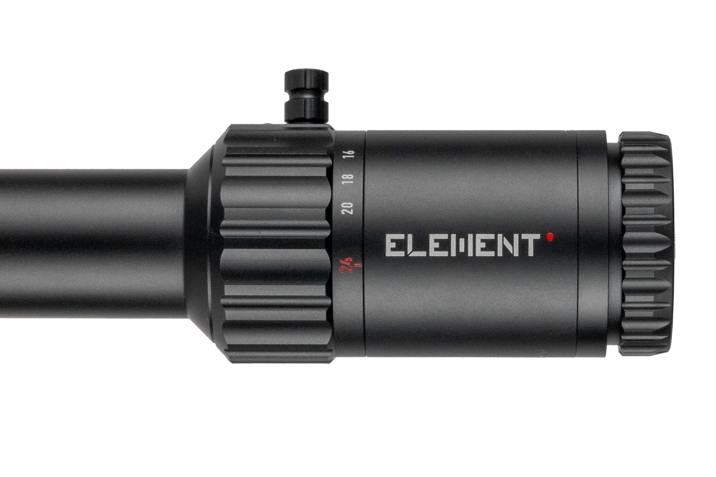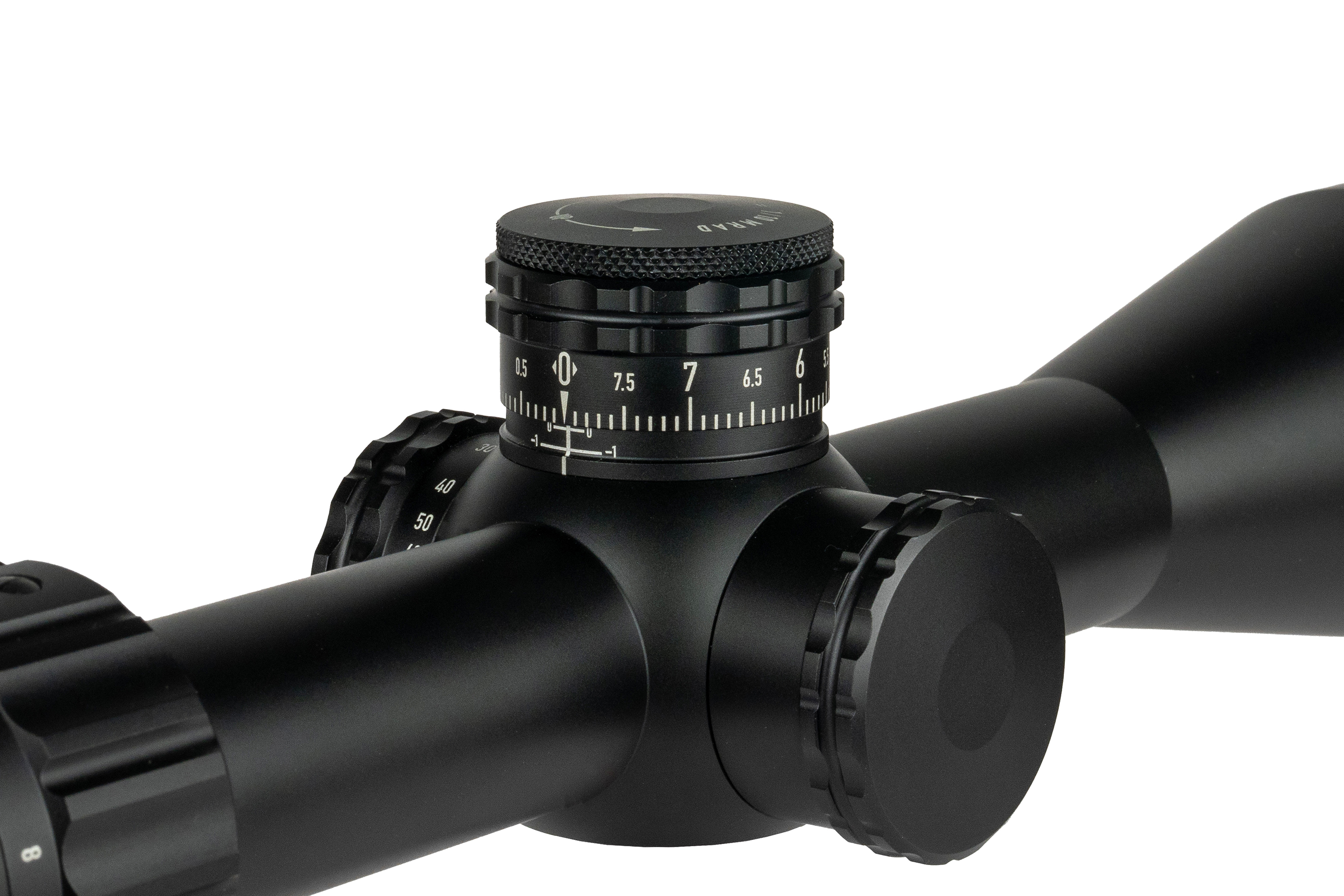 Neues Design mit verbessertem Klickgefühl, größerem Durchmesser (8 MRAD / 20 MOA pro Umdrehung) und niedrigerem Profil. Der Höhenturm bleibt offen mit Zero-Stop, der Seitenturm ist mit einem Gewindeschutzring versehen. - Inklusive Blendenring