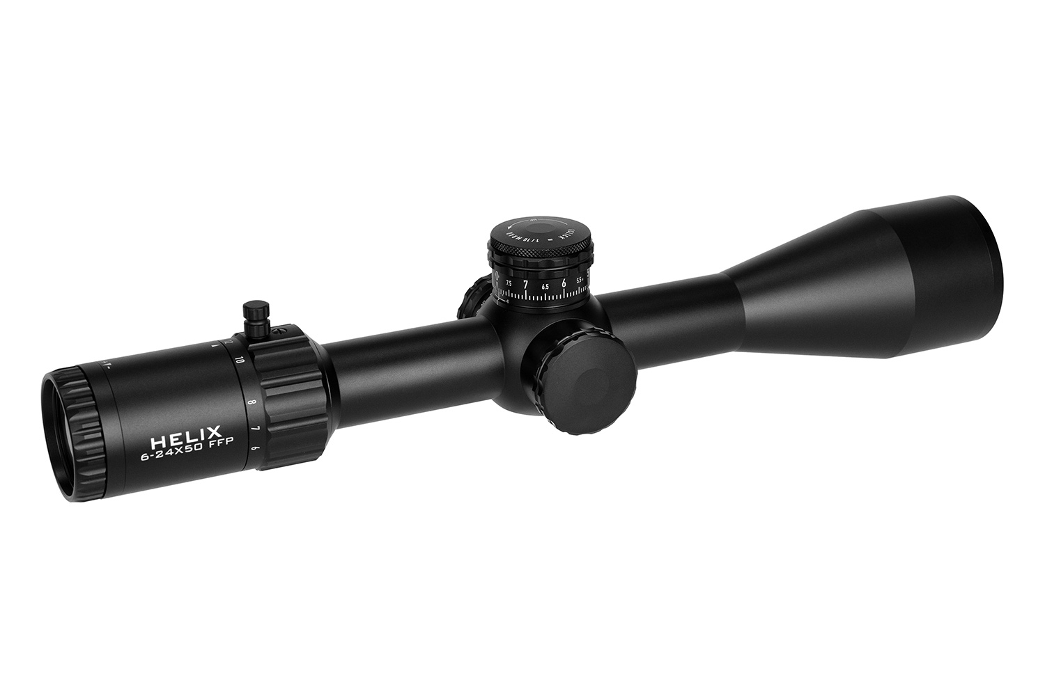 Neues Design mit verbessertem Klickgefühl, größerem Durchmesser (8 MRAD / 20 MOA pro Umdrehung) und niedrigerem Profil. Der Höhenturm bleibt offen mit Zero-Stop, der Seitenturm ist mit einem Gewindeschutzring versehen. - Inklusive Blendenring