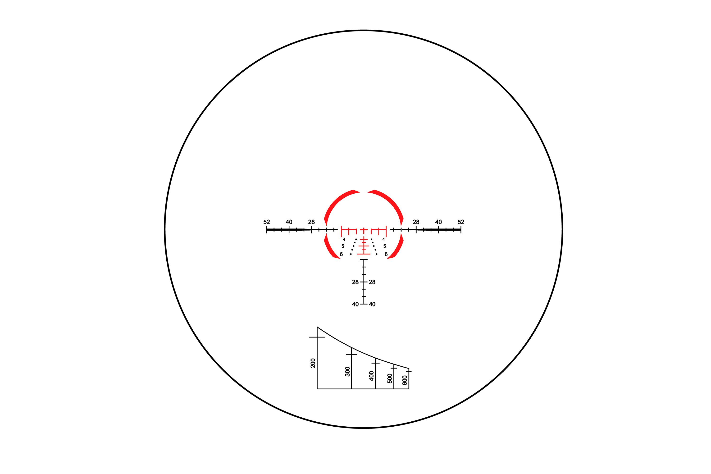 - LPR-Absehen (Low Power Reticle) inkl. Entfernungsskala, optimiert für Kaliber 5,56 mm/.223 Rem