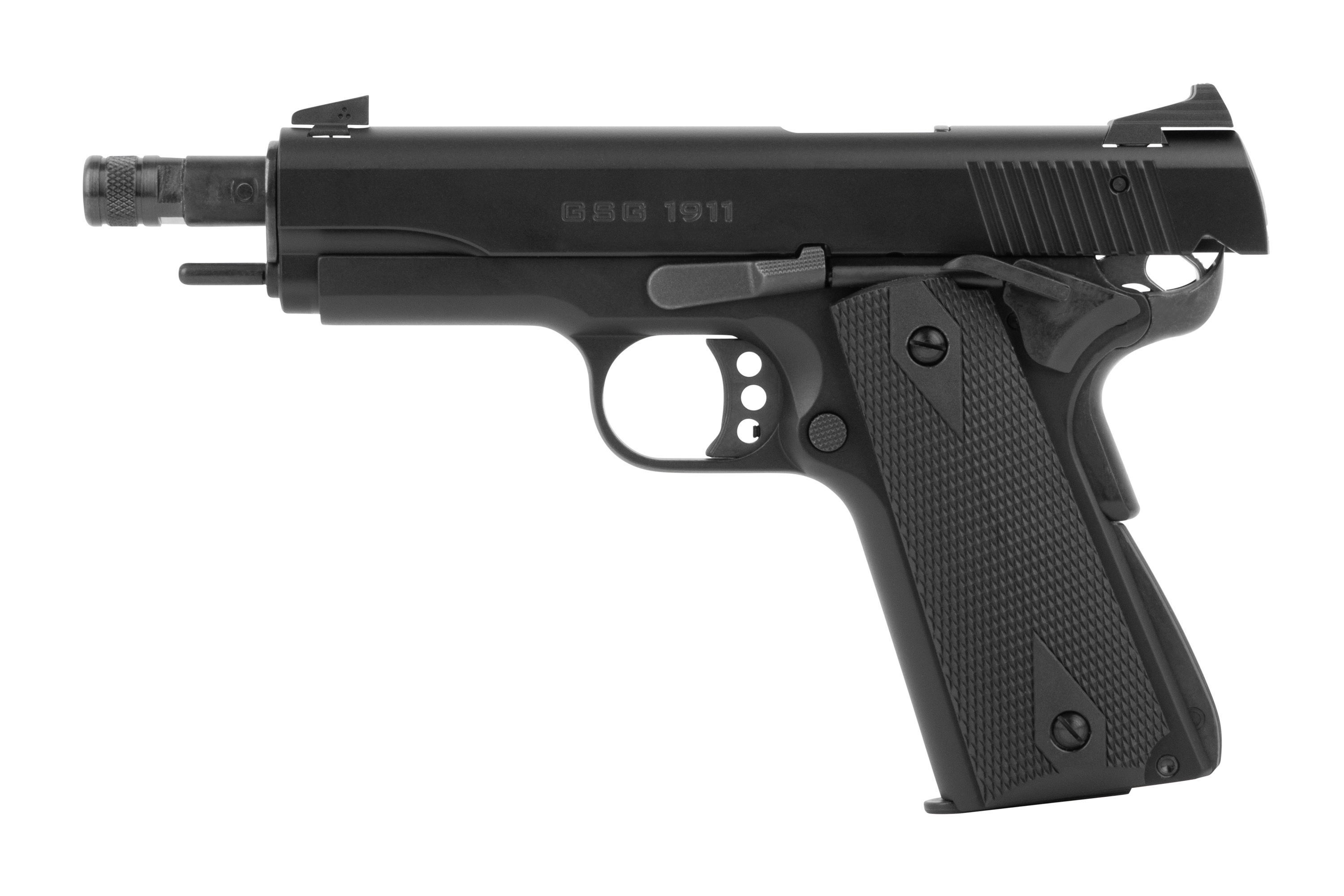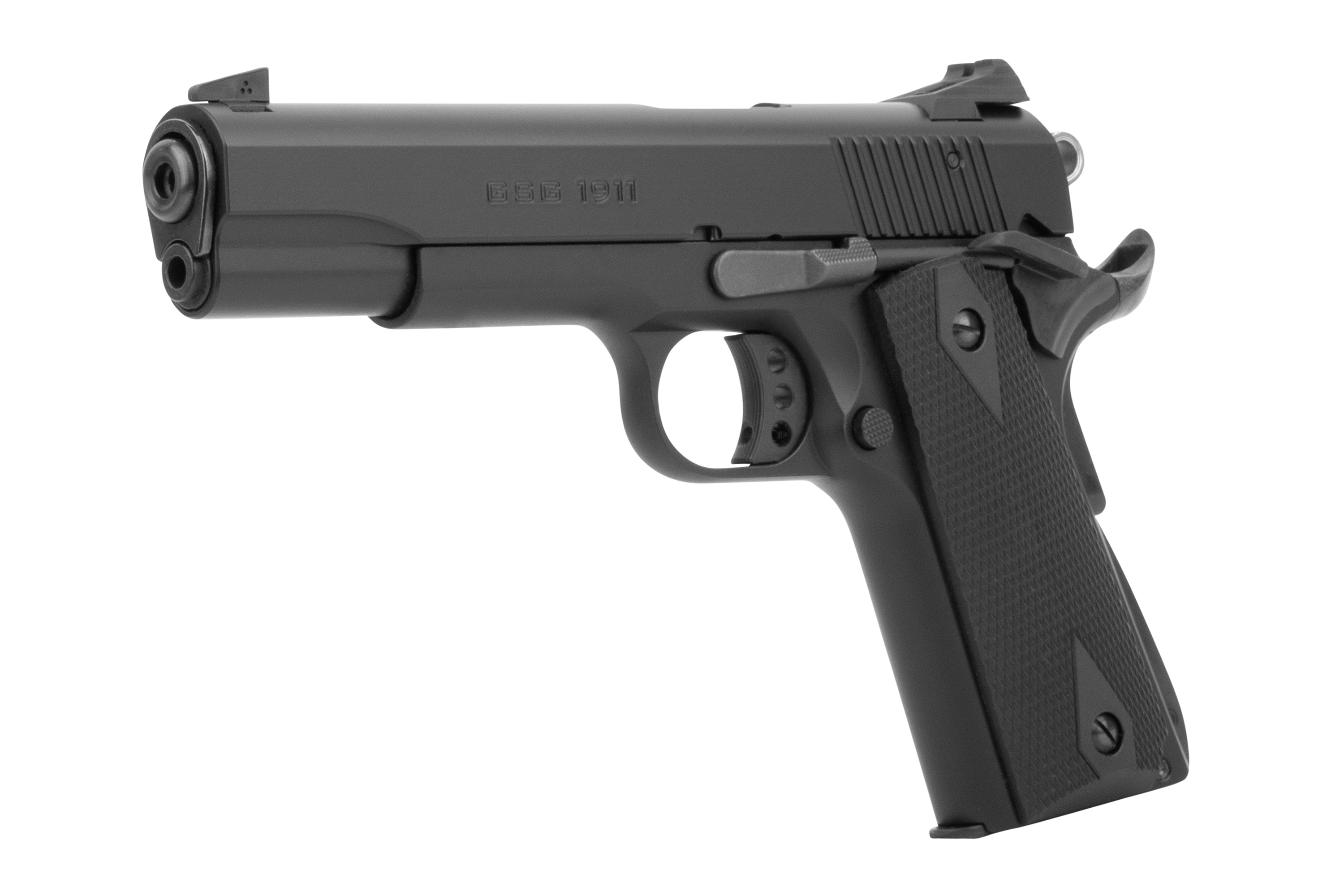 Die GSG 1911 besitzt ein Metallmagazin und kommt mit einer verstellbaren Visierung. Der Lauf ist ausgestattet mit einem Mündungsgewinde M9x0.75.