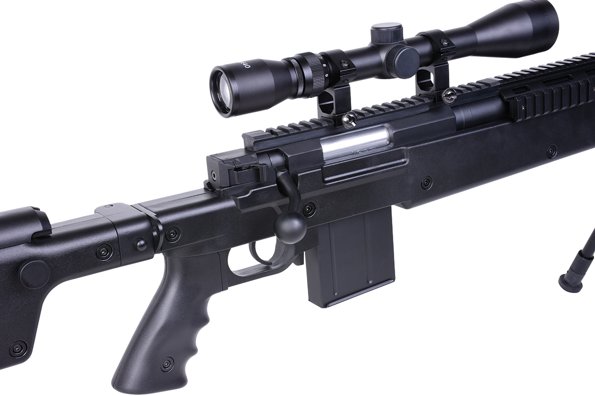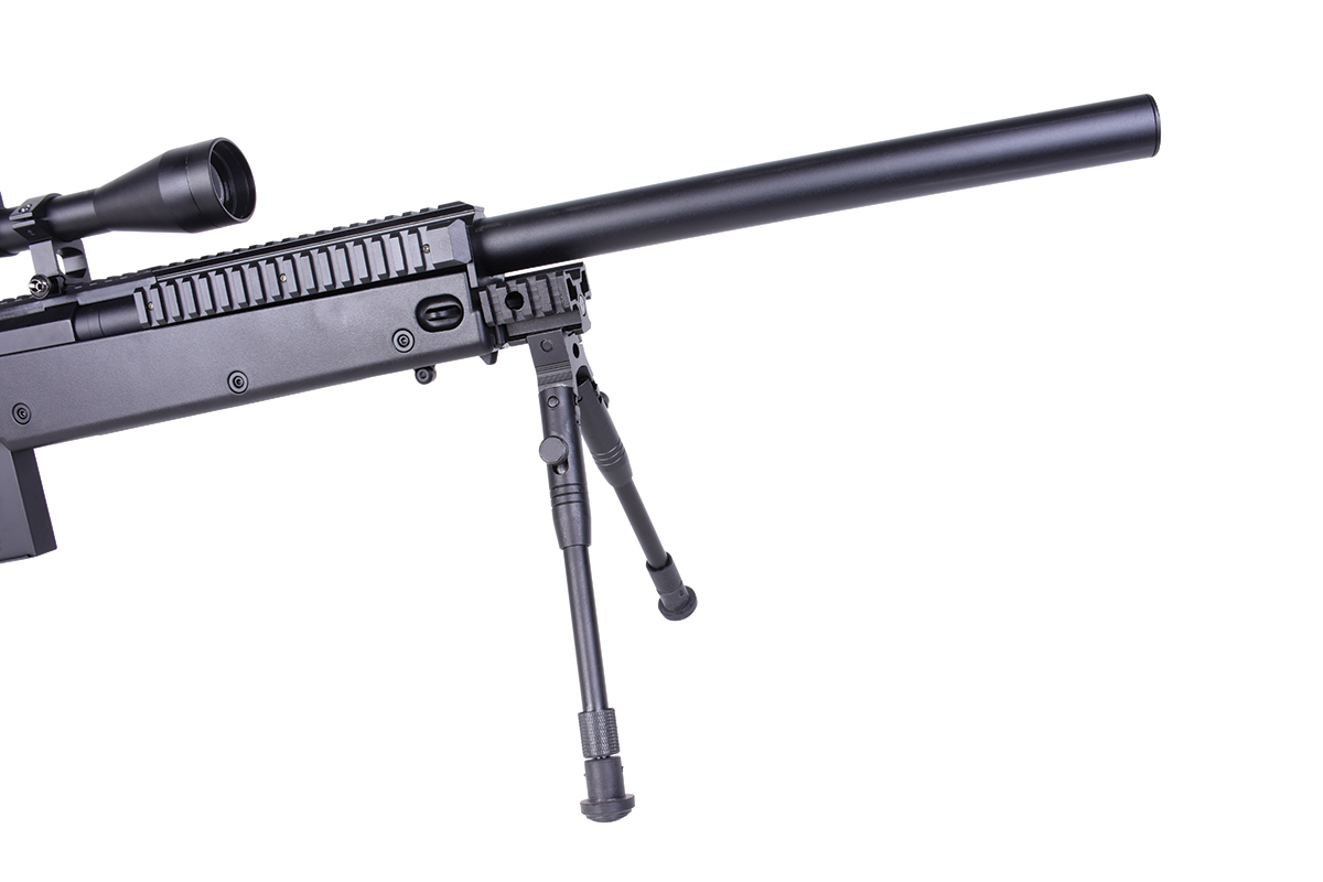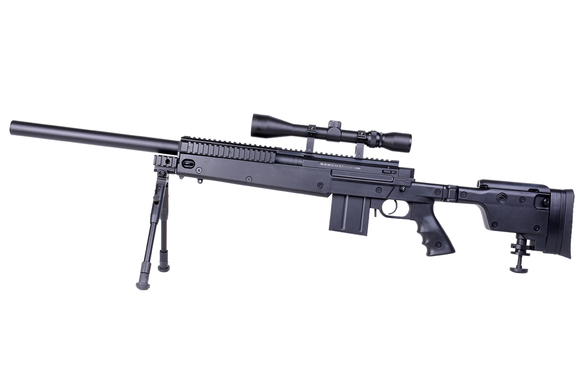 Das hochwertige Sniper-Gewehr aus dem Hause WELL mit einer Energie von ca. 1,7 Joule verfügt über eine einklappbare Schulterstütze, ein höhenverstellbares sowie klappbares Zweibein, eine höhenverstellbare Wangenauflage und diverse Railschienen. Gefertigt wird das Mododell aus Metall (Hauptgehäuse, Lauf & R.I.S.-System) sowie aus Nylonfiber-Kunststoff. Das bewährte Spin-Up System sorgt für Präzision auf höchstem Niveau. Die Lieferung erfolgt inklusive Metall-Zielfernrohr 3-9x40 mit Fadenkreuz, Ringmontagen und Staubschutzkappen. Das Zweibein wird mittels der mitgelieferten Aluminium-Tri-Mount befestigt und kann dadurch auch schnell wieder abgenommen werden. Ebenfalls sind ein Tragegurt und ein Speedloader im Lieferumfang enthalten.