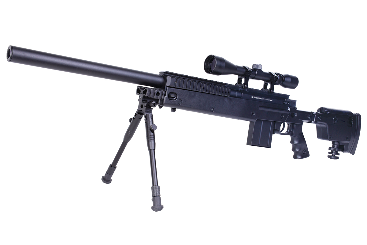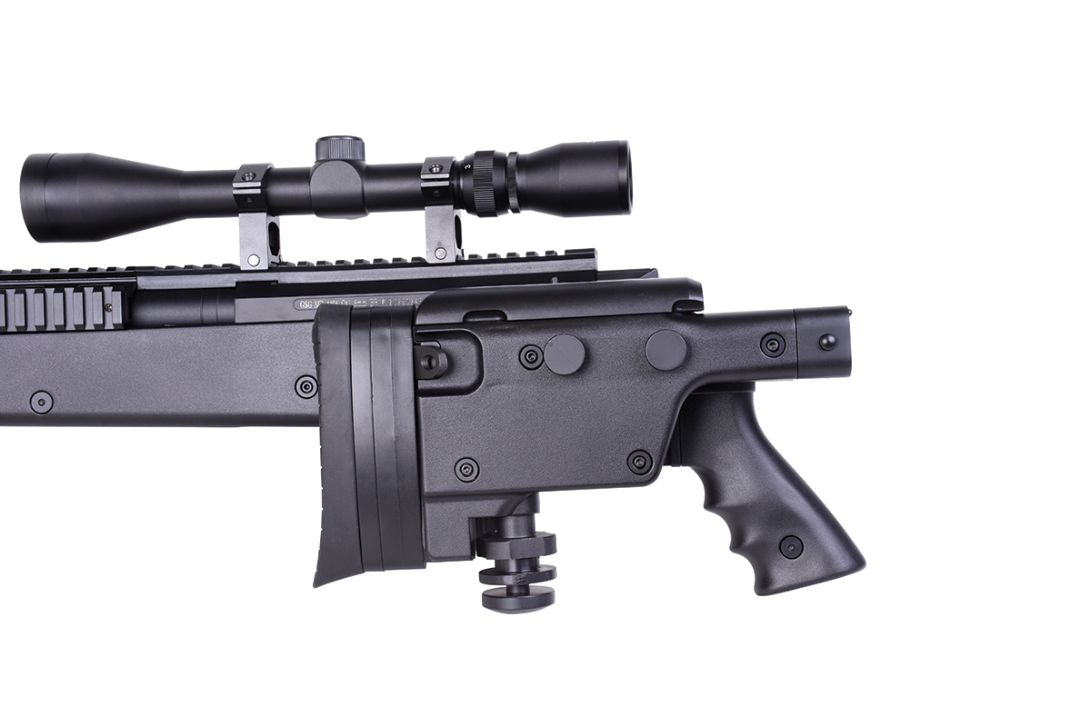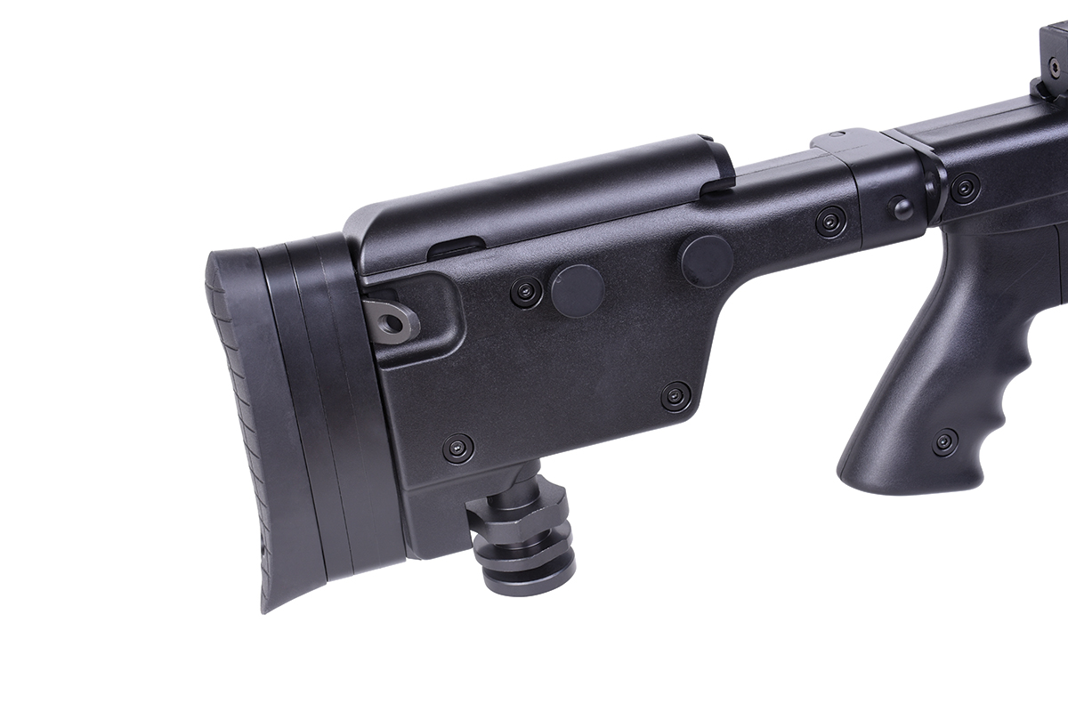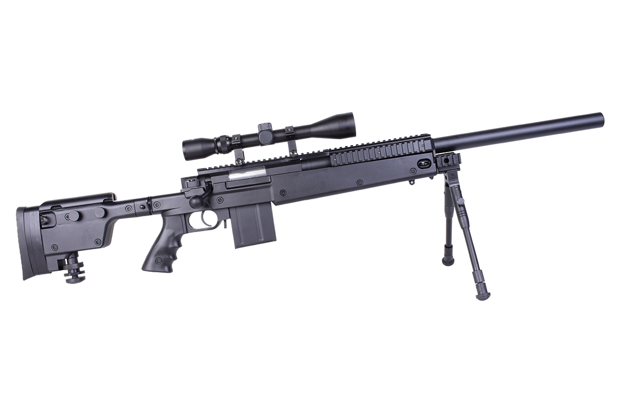 Das hochwertige Sniper-Gewehr aus dem Hause WELL mit einer Energie von ca. 1,7 Joule verfügt über eine einklappbare Schulterstütze, ein höhenverstellbares sowie klappbares Zweibein, eine höhenverstellbare Wangenauflage und diverse Railschienen. Gefertigt wird das Mododell aus Metall (Hauptgehäuse, Lauf & R.I.S.-System) sowie aus Nylonfiber-Kunststoff. Das bewährte Spin-Up System sorgt für Präzision auf höchstem Niveau. Die Lieferung erfolgt inklusive Metall-Zielfernrohr 3-9x40 mit Fadenkreuz, Ringmontagen und Staubschutzkappen. Das Zweibein wird mittels der mitgelieferten Aluminium-Tri-Mount befestigt und kann dadurch auch schnell wieder abgenommen werden. Ebenfalls sind ein Tragegurt und ein Speedloader im Lieferumfang enthalten.