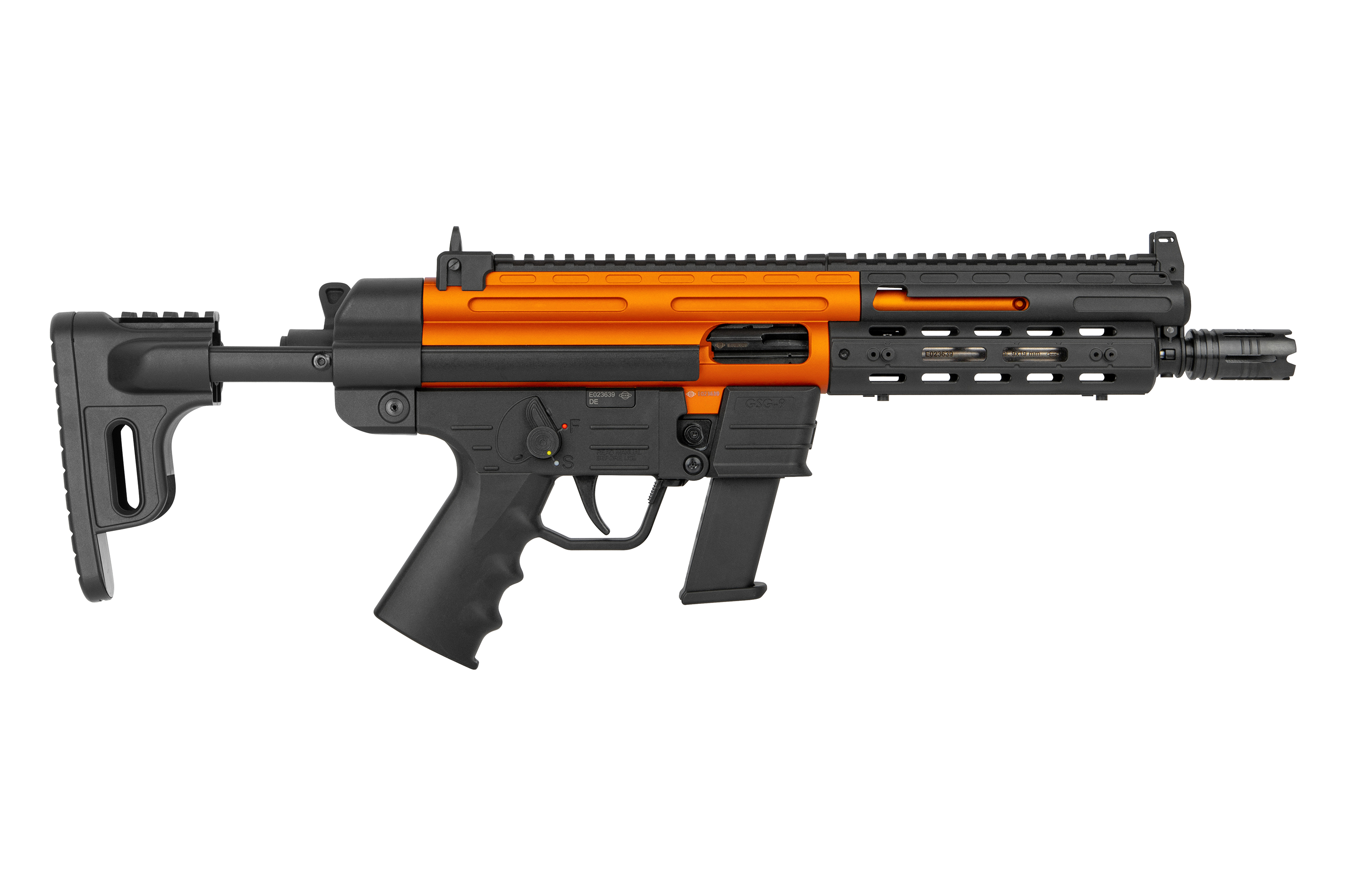 Kaliber 9x19 trifft auf Kontrolle und Präzision - die GSG-9 Rifle im Kaliber 9 mm Luger als Langwaffe mit fixiertem Schaft in stylischem Bicolor: Schwarz & Electric Orange ergänzen sich zu einem echten Hingucker.