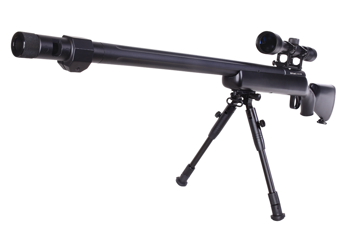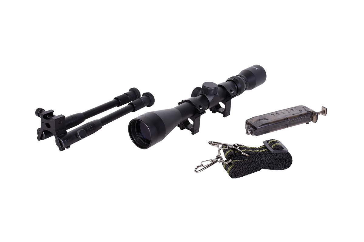 Der sehr gelungene Nachbau mit Federdrucksystem und einer Energie von ca. 1,8 Joule wird inkl. Zielfernrohr geliefert und verfügt über einen Außenlauf im Fluted-Barrel-Design, einen abnehmbaren Flash-Hider (18mm-Rechtsgewinde), ein Metall-Zweibein, Montageschienen und das bewährte Spin-Up System für Präzision auf höchstem Niveau. Schaft und Magazin werden aus hochwertigem Kunststoff gefertigt, Außenlauf, Upper Receiver, Abzugseinheit, Zylinder und Zweibein bestehen aus Metall. Das mitgelieferte federgelagerte Zweibein ist klapp- sowie höhenverstellbar und verfügt über gummierte Füße für einen sicheren Stand. Im Lieferumfang sind außerdem ein Speedloader und ein Tragegurt enthalten.