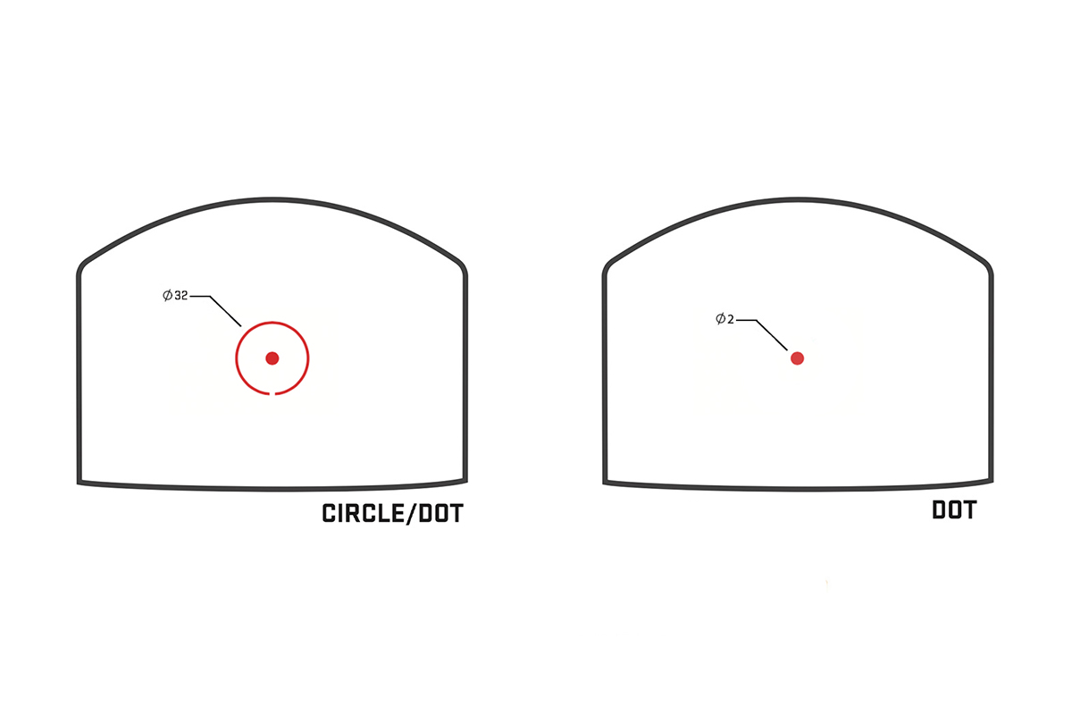 - Umstellbares Absehen mit einem 2 MOA Dot, 32 MOA Circle und 2 MOA Dot/32 MOA Circle