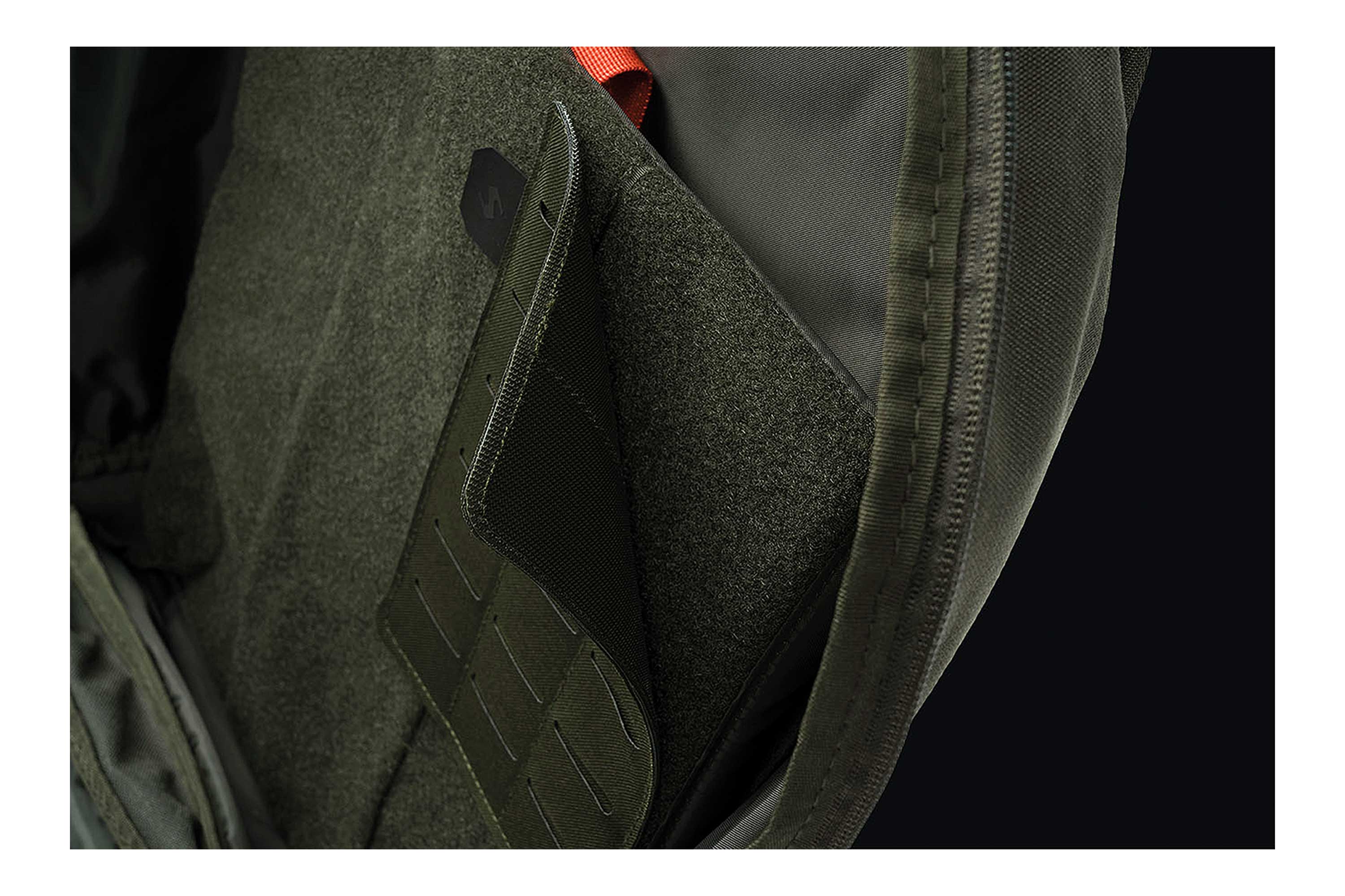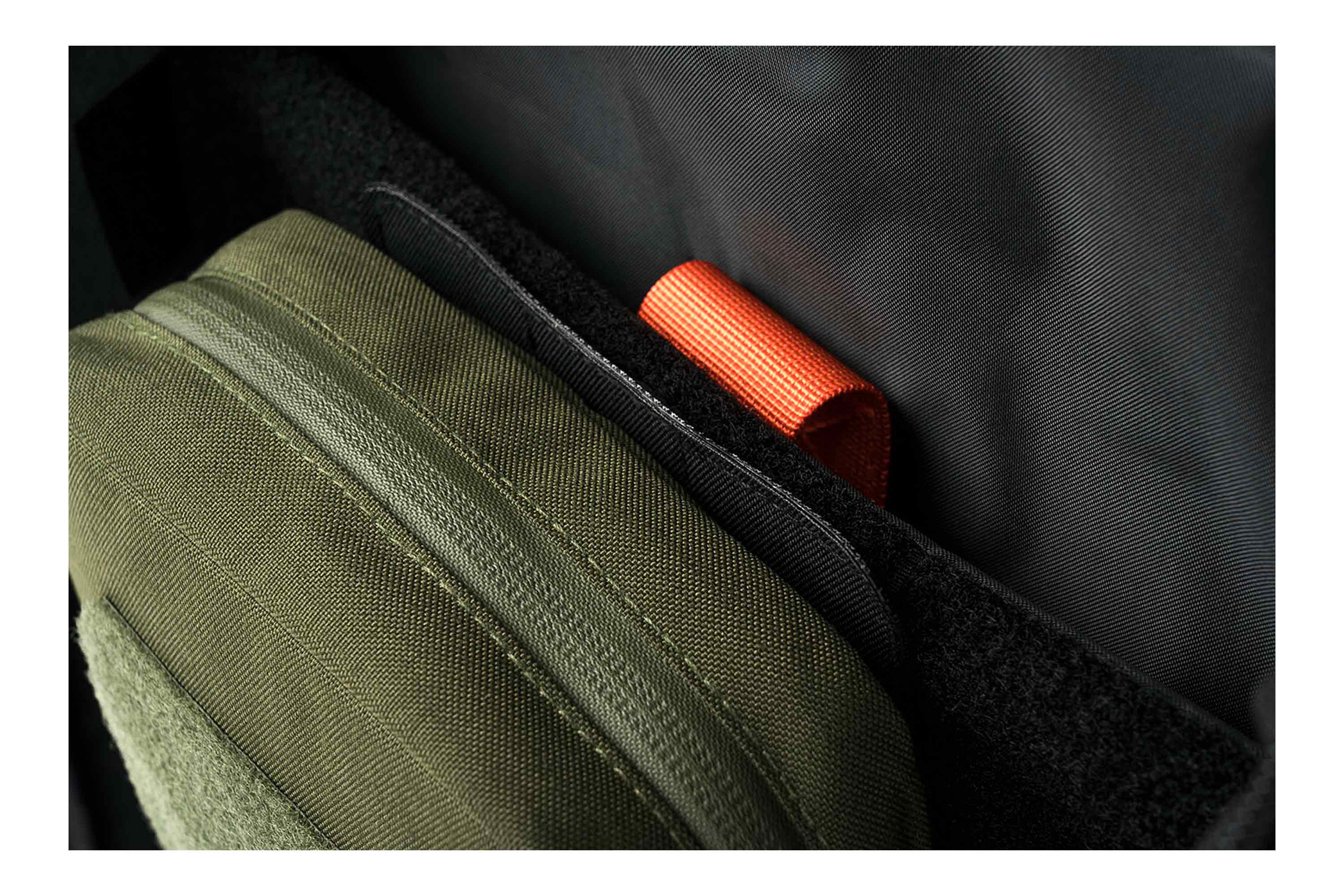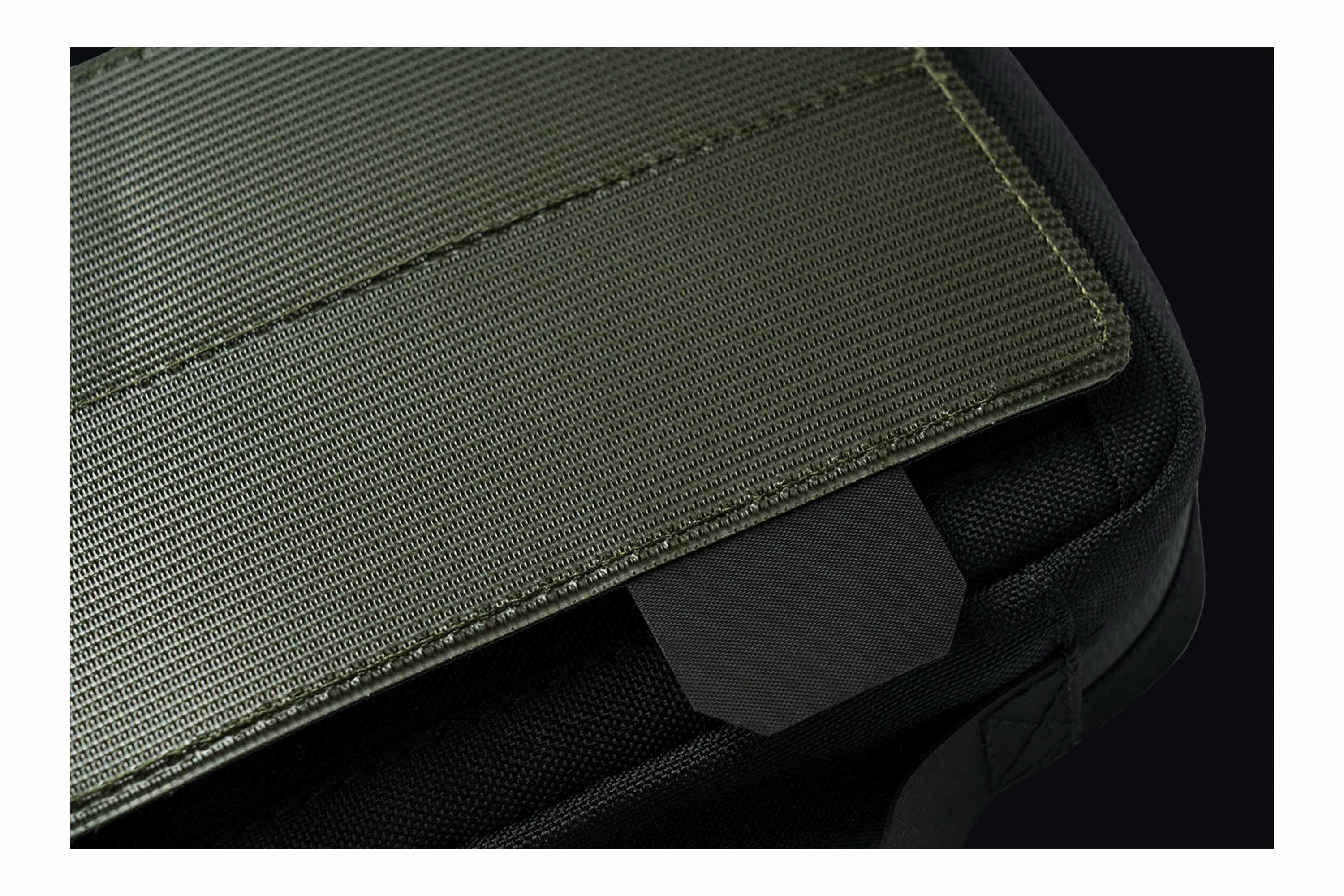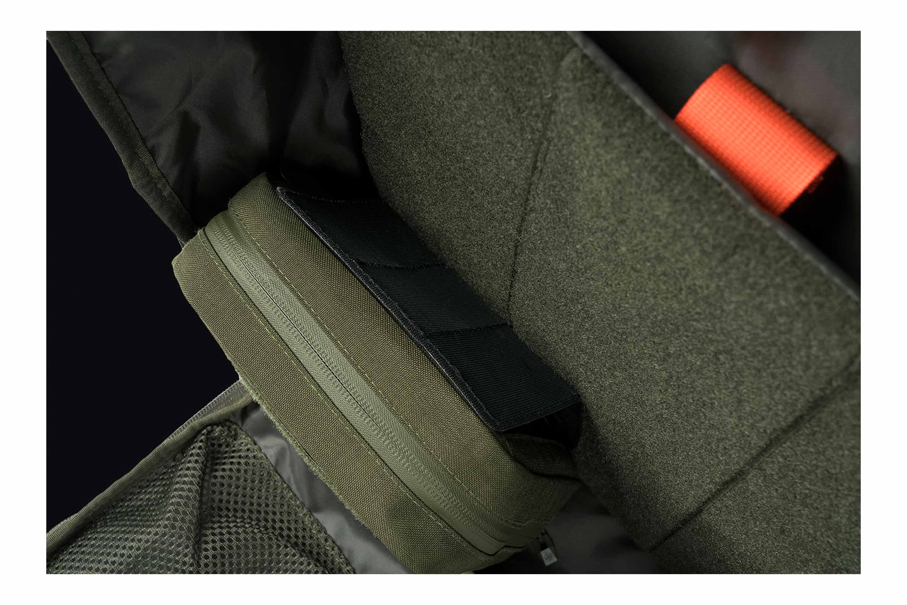 Die Vorderseite ist mit einem Laser-Cut MOLLE-System ausgestattet, das eine stabile Befestigung kompatibler Pouches und Zubehörteile ermöglicht. Auf der Rückseite befindet sich eine Klettfläche (Velcro), die eine schnelle und sichere Fixierung in entsprechenden Rucksäcken oder Trägersystemen erlaubt.