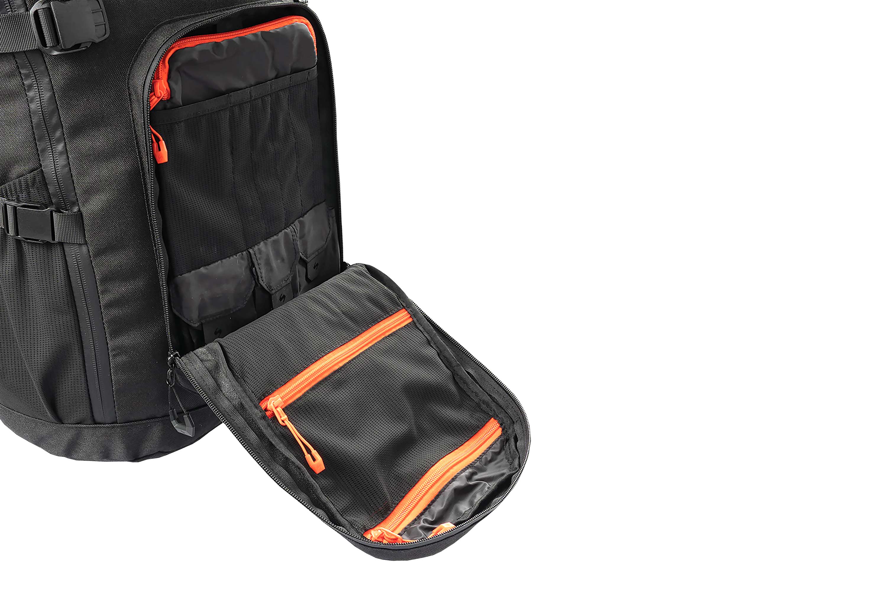 Auch das Frontfach lässt sich vollständig öffnen und bietet zusätzliche Organisationsmöglichkeiten. Zwei interne Mesh-Reißverschlusstaschen sowie ein herausnehmbares Organizer-Panel erleichtern die strukturierte Aufbewahrung kleinerer Ausrüstungsgegenstände.