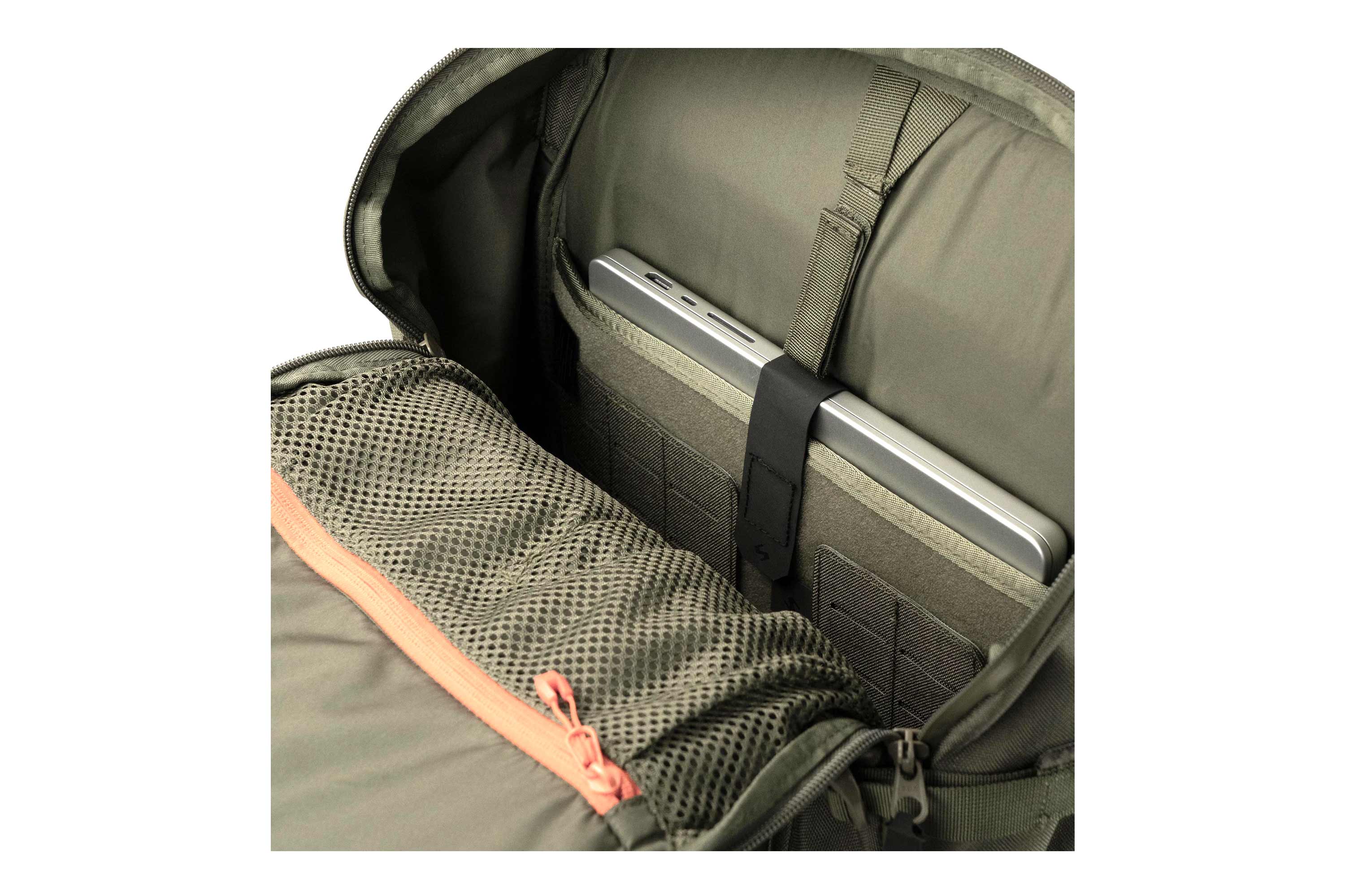 Der Rucksack bietet zahlreiche Möglichkeiten zur individuellen Organisation der Ausrüstung. Re-konfigurierbare MOLLE-Flächen mit Klettbefestigung ermöglichen die flexible Erweiterung und Anpassung des Innenraums.